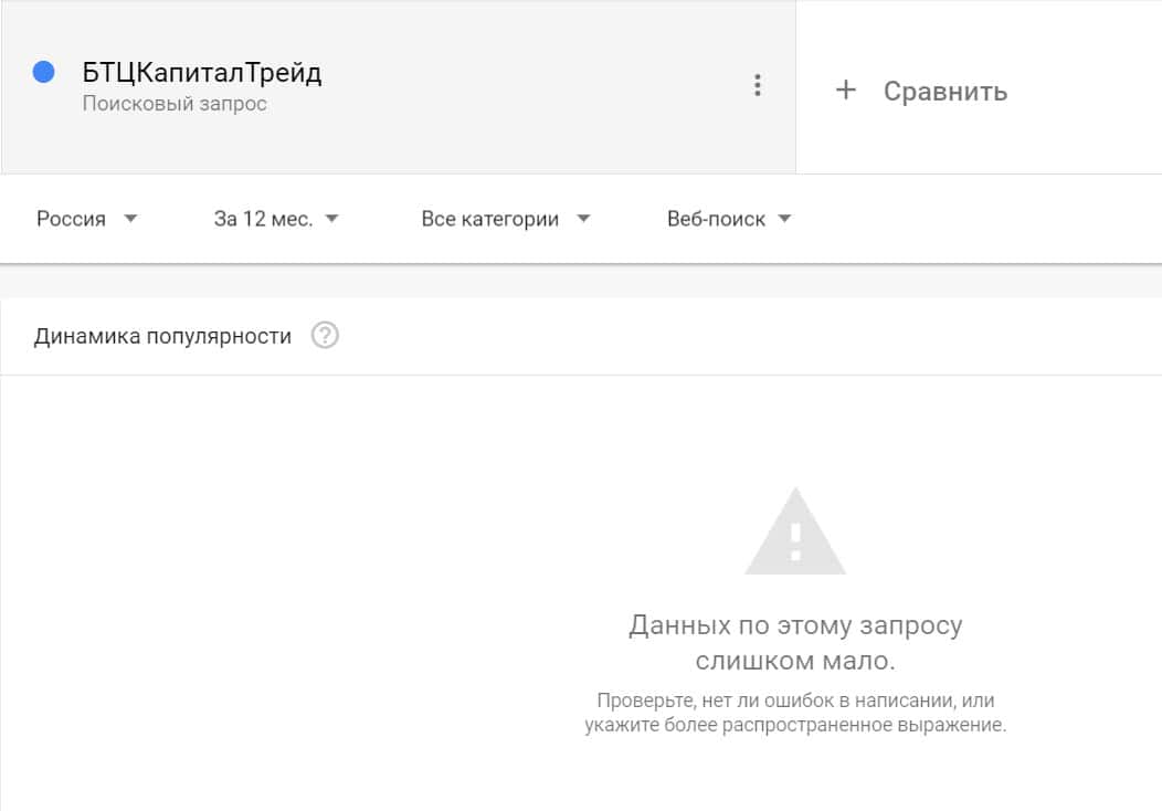 В Гугл Трейнды нет какого-либо количества запросов по англоязычным вариантам названий лохотрона, перейдем к вариантам названий на русском языке, первый "БТЦ Капитал Трейд".