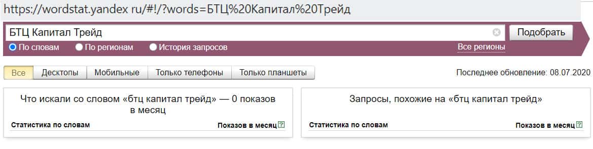 По запросу "БТЦ Капитал Трейд" Яндекс Вордстат также показал количество 0 раз, это свидетельствует о еще не совсем достаточной популярности данного лохотрона в СНГ.