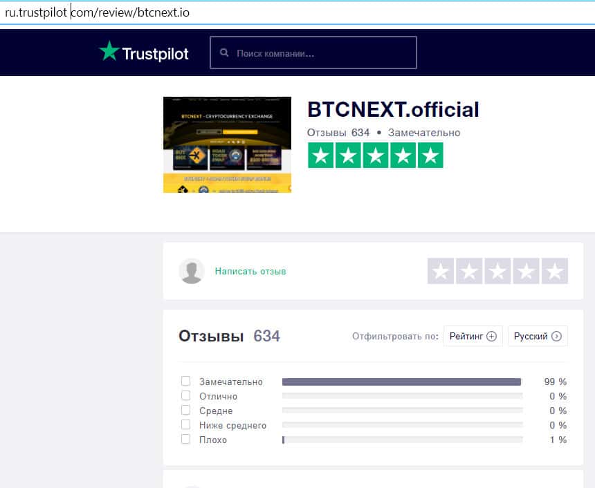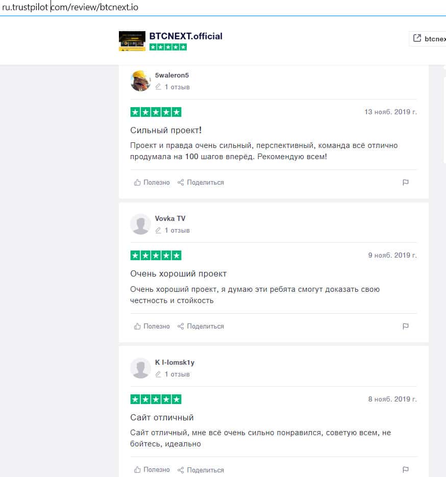 На сайте trustpilot.com 619 отзывов на разных языках про BTCNext и абсолютно все положительные с оценкой 5 из 5, это настораживает и вызывает подозрения. Вероятно, негативные отзывы своевременно удаляются из сети, ведь это испортит репутацию жуликам.