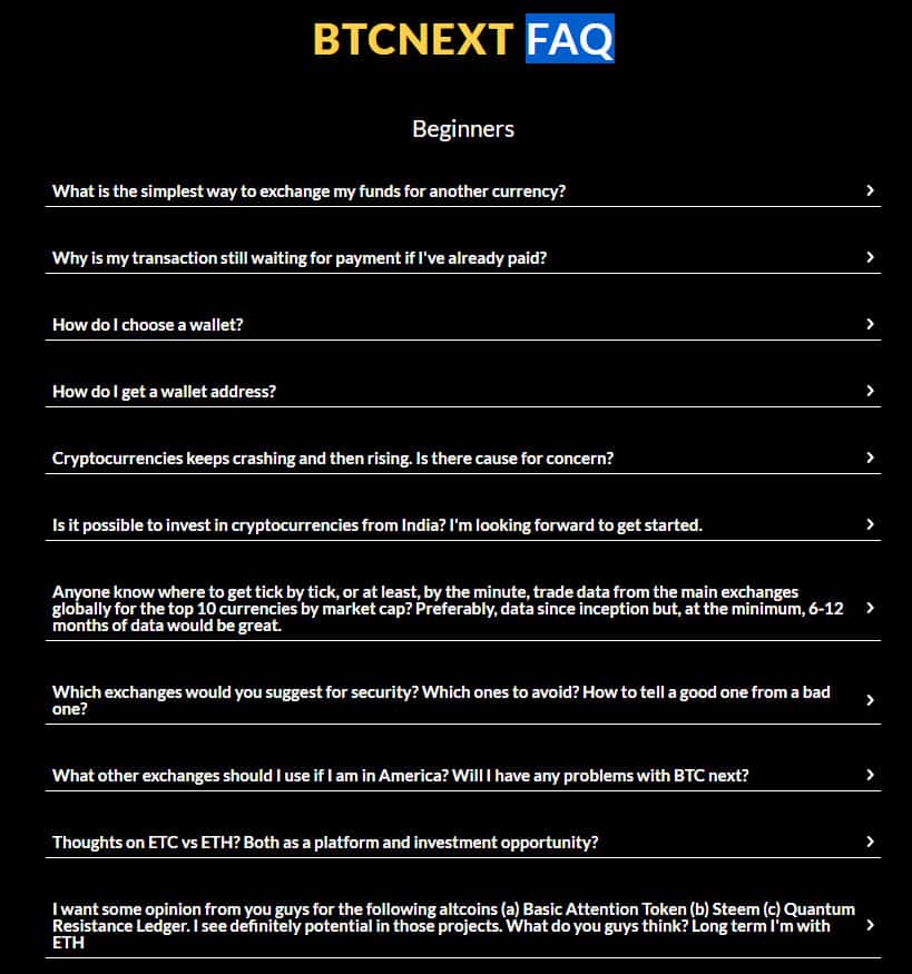 БТЦ Некст располагает справочным разделом FAQ (часто задаваемые вопросы), который призван помогать лучше разобраться пользователям в тонкостях торговли криптовалютой. Ведь организаторы заботятся о своих клиентах! Правда, раздел полностью англоязычный, так что, если вы не владеете английским в совершенстве, вам будет довольно трудно понять, что хотели разъяснить владельцы сайта о криптомонетах.