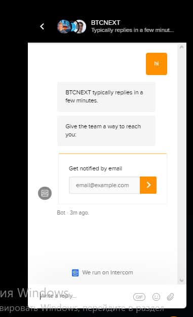 Несмотря на то, что главная страница и почти вся основная информация, размещенная на сайте BTCNext, доступна на русском языке, связь с техподдержкой существует только на английском. Сам чат, скорее всего, фейковый, так как при обращении туда, выходит окно с требованием указать свой имейл.