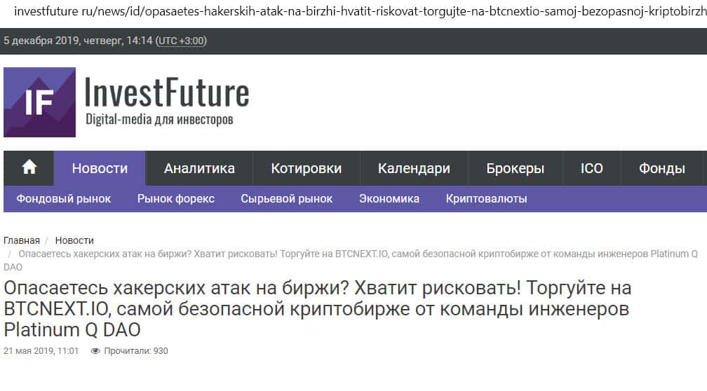 Однако, имеется и одна статья на русском языке, размещенная на площадке BTCNext с сайта investfuture ru. Автор необоснованно называет жульническую контору самой безопасной криптобиржей (!), совершено непонятно, на каком основании. Причем, эти выводы ничем необоснованы, он просто призывает трейдеров торговать именно на BTCNext. Налицо все признаки заказного текста.