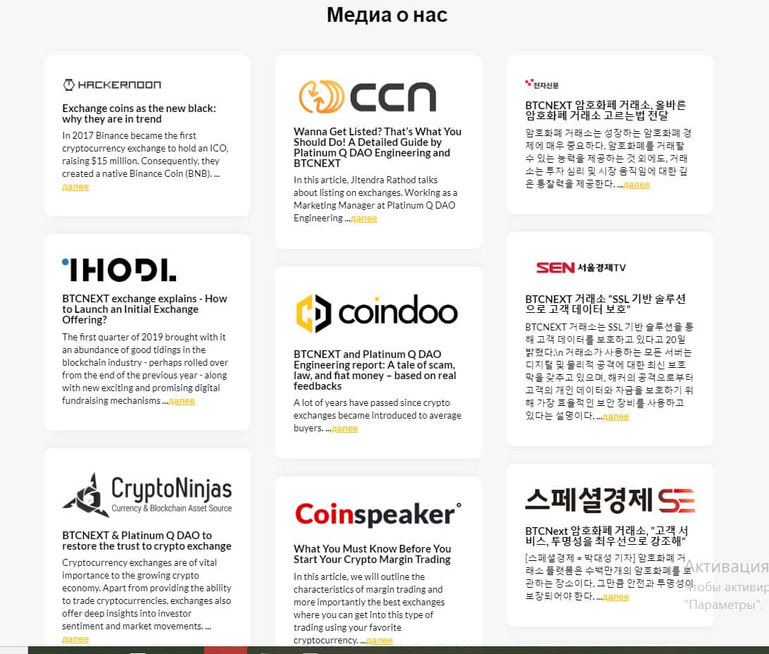 На главной странице сайта BTCNext публикуется множество ссылок на статьи, написанные об этой жульнической конторе на японском, корейском, английском языках. Неужели компания, организованная в недавнее время, так быстро завоевала огромную популярность медиамасс во всем мире? Этот факт кажется очень странным и необъяснимым. Безусловно, статьи заказные, а публикация их на иностранных языках должна повышать интерес потенциальных клиентов и пускать пыль в глаза начинающим трейдерам.
