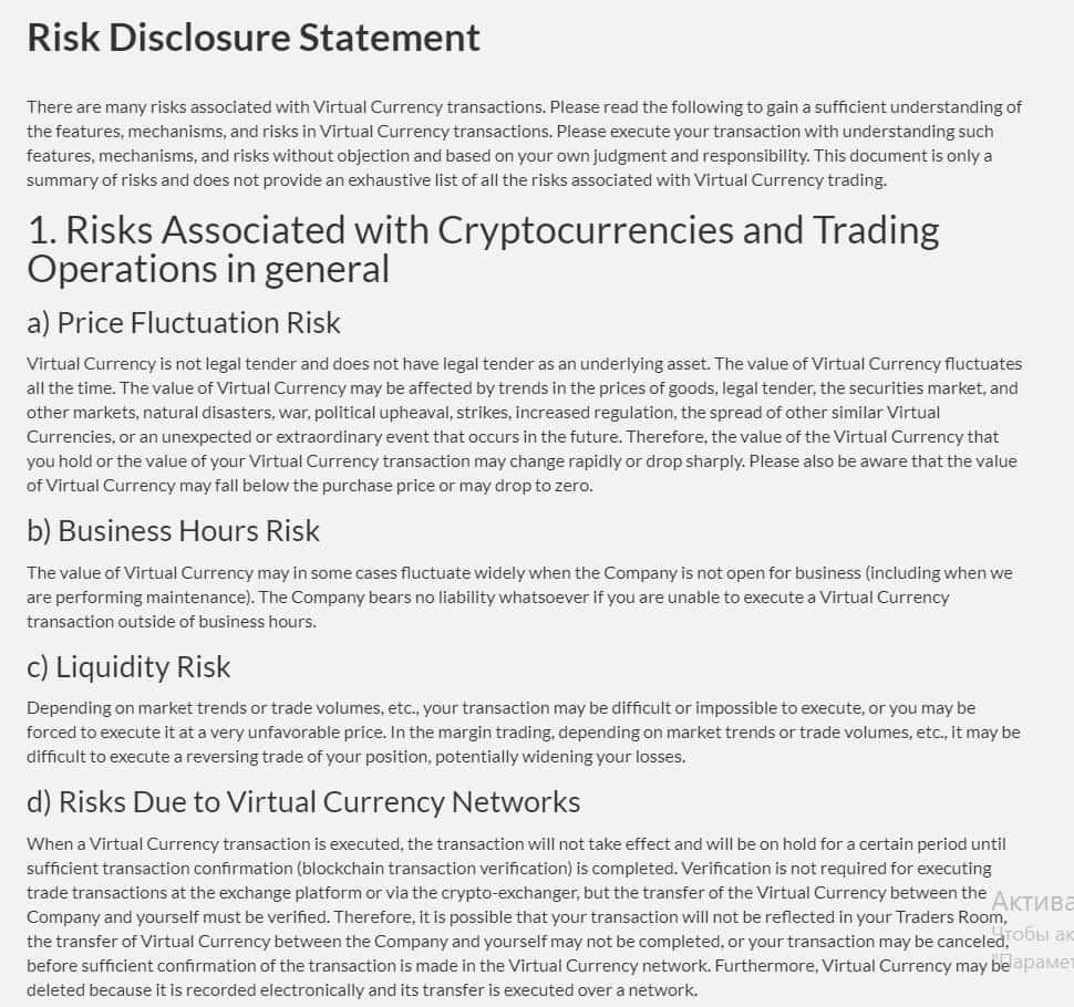БТЦ Некст признает, что вы рискуете потерять свои средства, торгуя криптой на ее сайте. Но узнать об этом вы можете, если зайдете в раздел Раскрытие рисков и прочитаете статью об этом, опубликованную на английском. Понятно, что большинство русскоязычных пользователей читать эту информацию не будет. То есть, видна явная уловка со стороны организаторов БТЦ Некст - неправильное информирование клиентов о рисках торговли криптовалютой.
