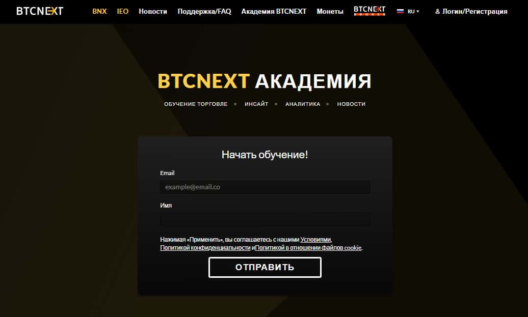 BTC Next располагает таким важным разделом, как Академия, попав на который вы увидите окошечко с предложением начать обучение. Но оно, почему-то начинается со сбора личных данных пользователя, таких, как электронная почта и его имя. Понятно, что в дальнейшем эти данные будут использованы компанией в своих целях, для рассылки спама или других мошеннических действий.