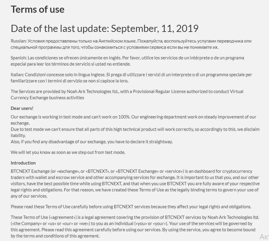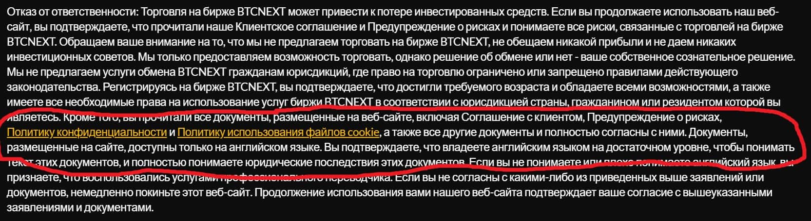 После длительных попыток выяснить, существует ли клиентское соглашение у BTC Next, находим внизу главной страницы запись о том, что соглашение с клиентом у компании все-таки есть, но оно доступно только на английском языке. Также вам дают понять, что вы должны иметь хорошее знание английского языка, для того, чтобы понять, о чем идет речь в этом документе.