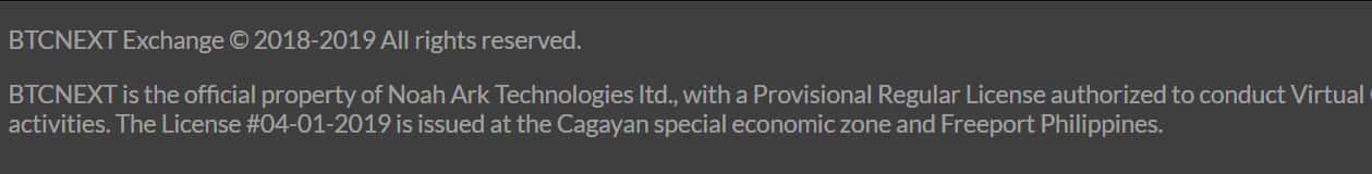 Единственное упоминание о лицензии BTC Next можно найти в самом низу страницы, к тому же, написанную очень мелким шрифтом незаметного серого цвета. Там написано, что документ получен в свободной экономической зоне, на Филиппинах. Дата выдачи - четвертое января 2019 года. Из этого сообщения понятно, что сайту нет и одного года, что наводит на мысль о неком новом мошенническом проекте. Самого документа мы, конечно же, не увидим.