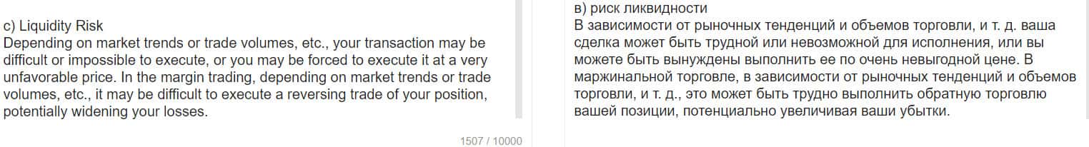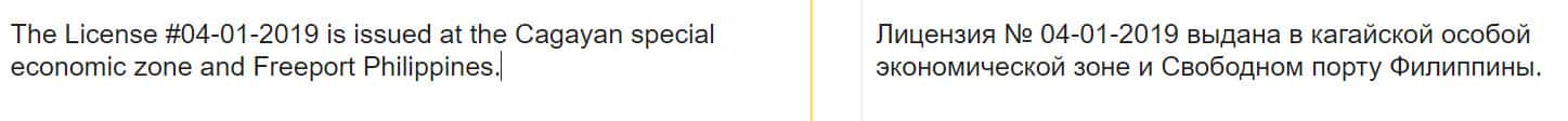Мало того, что запись о наличии лицензии найти практически невозможно, она еще и на английском языке. Для англоязычных пользователей может, и не составит труда прочитать это сообщение, но по отношению к российским трейдерам это, опять-таки проявление неуважения.