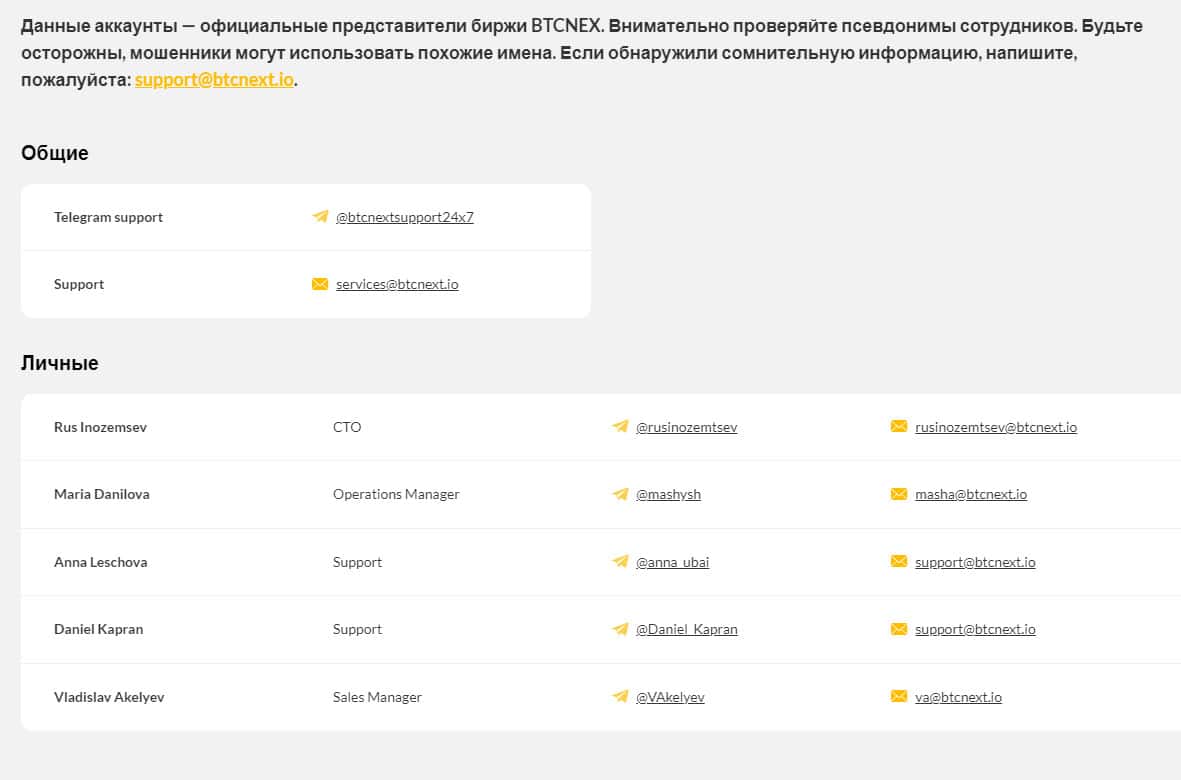 Можно ли увидеть руководителей дилингового центра BTCNext? Переходим на вкладку Официальные представители БТЦ Некст. Там имеется список имен, а также электронных адресов, по которым можно связаться с тем или иным представителем брокерской компании. Однако, запись вверху страницы говорит нам о том, что данные имена - всего лишь псевдонимы, а информация о руководителях остается неизвестной.