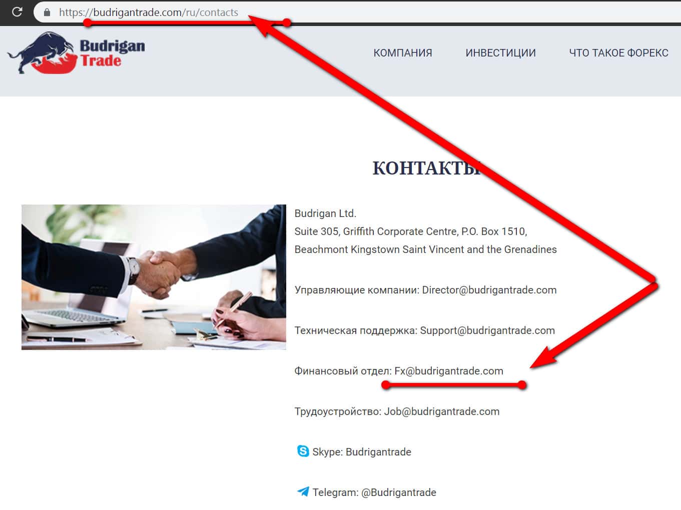 Чтобы вопросов на счет РЕАЛЬНОСТИ переписки не было, мы приводим РЕАЛЬНО опубликованный на официальном сайте мошенников budrigantrade com их контакты, в частности официальную электронную почту: fx@budrigantrade com