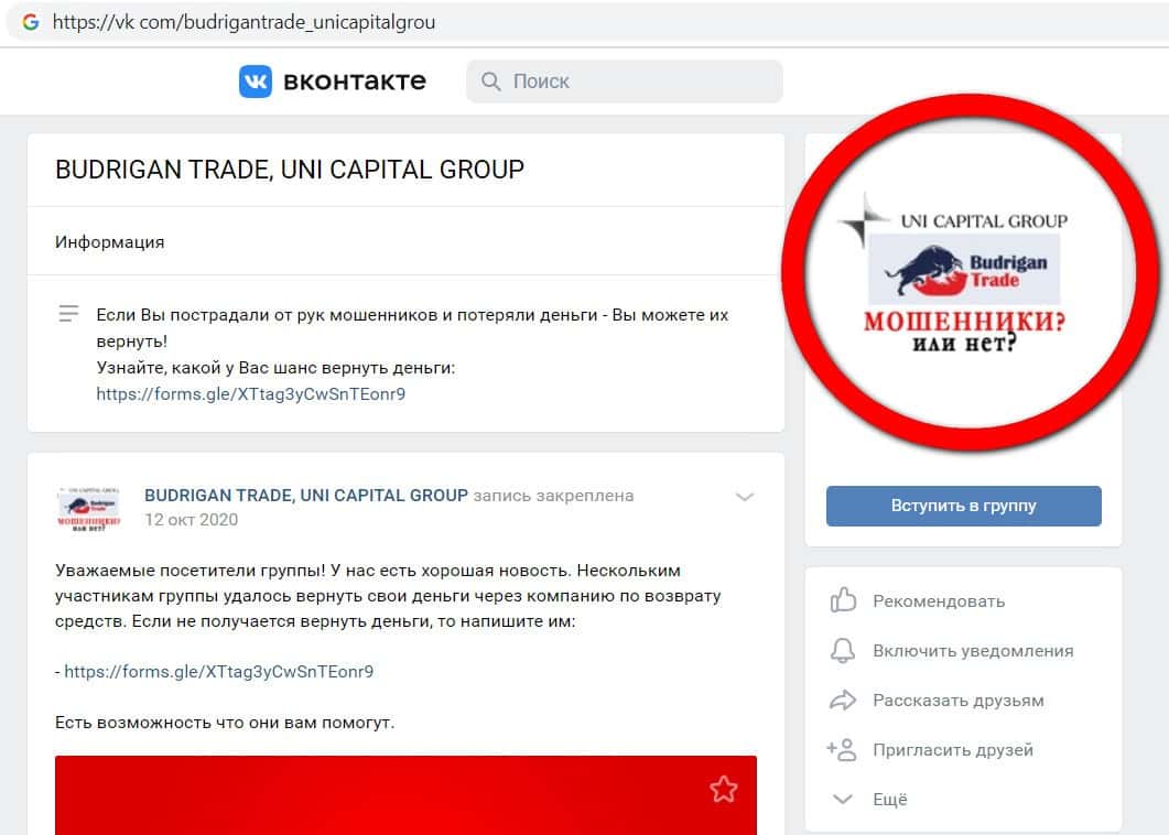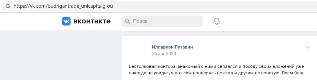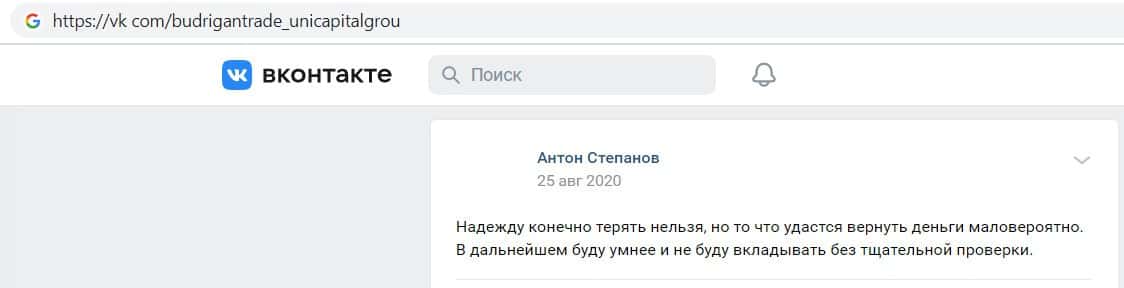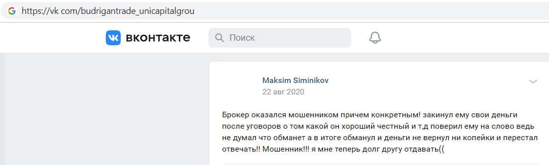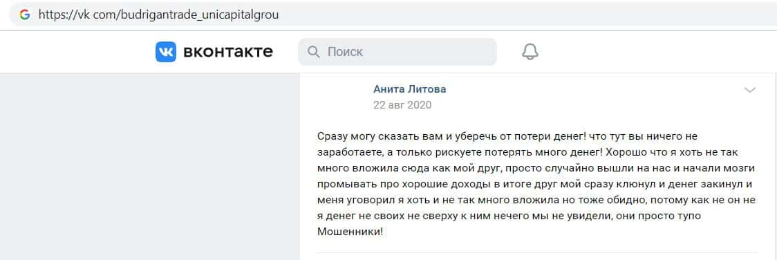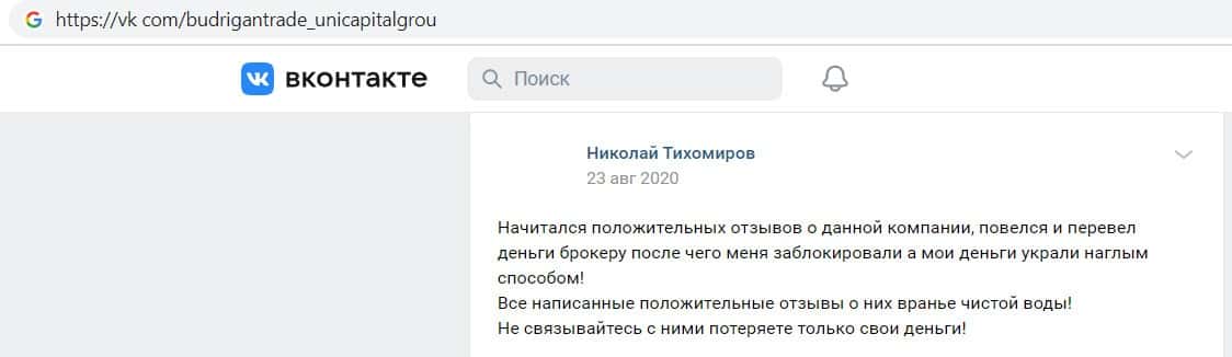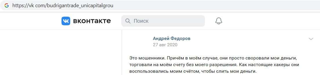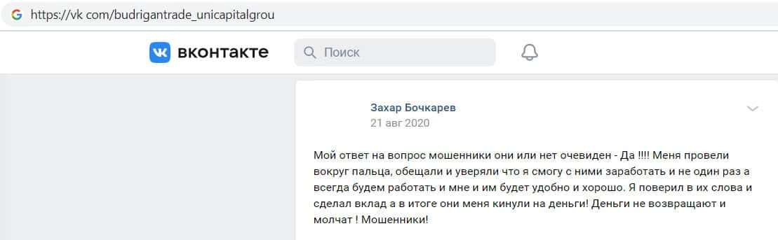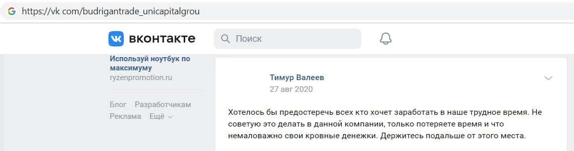 Далее представлен скрин группы в социальной сети Вконтакте, в которой публикуется информация от пострадавших от деятельности BudriganTrade и Uni-Capital людей.