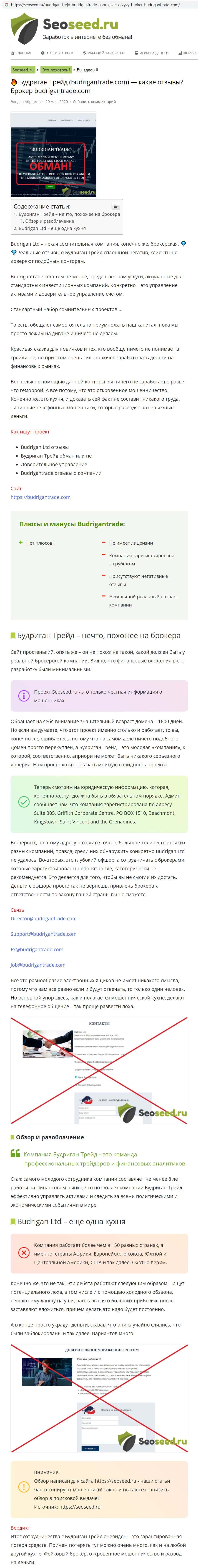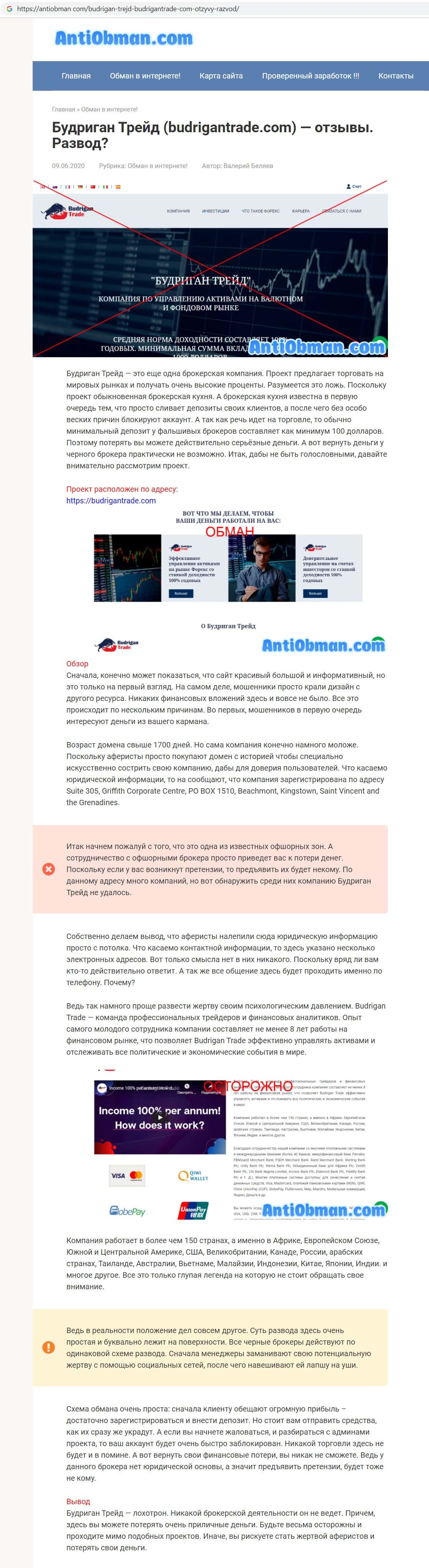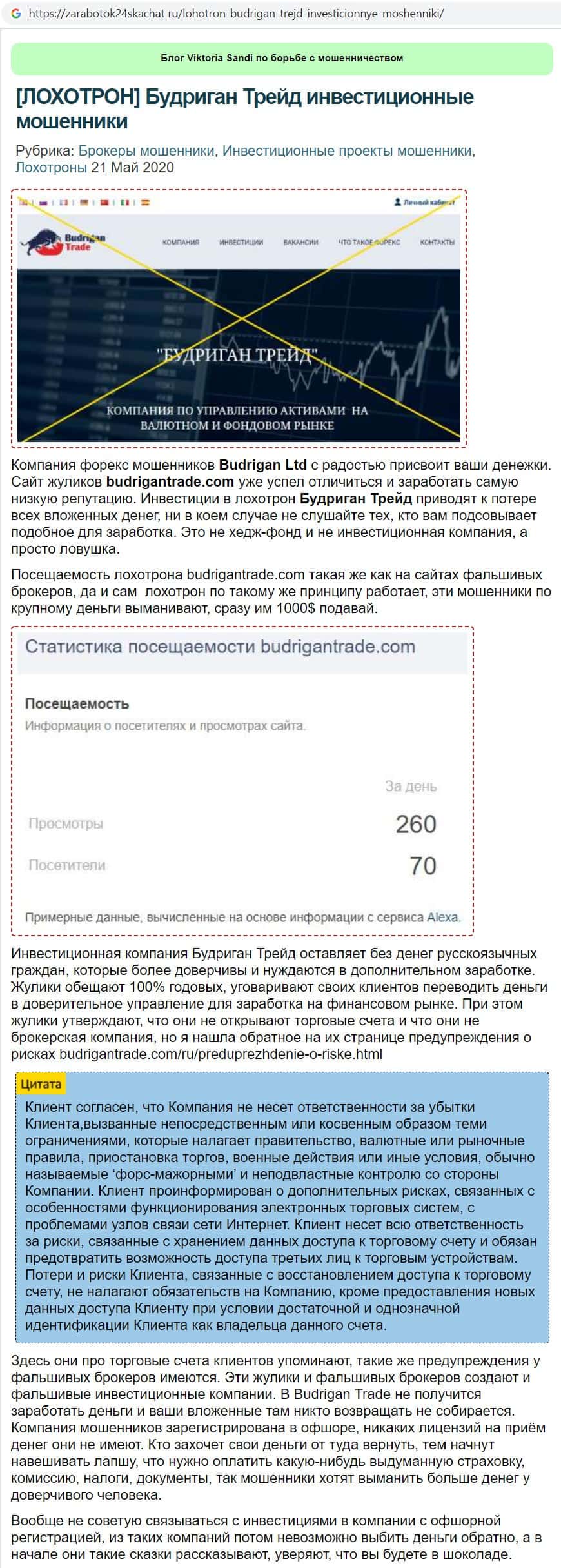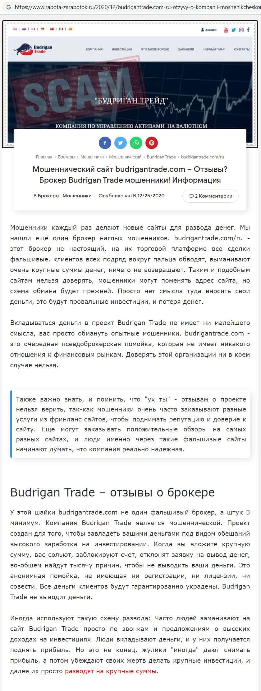 Авторитетный интернет-портал Forex-Scam Org причислил BudriganTrade Com к мошенническим организациям. О том, что брокерская компания Будриган Трейд является мошенническим онлайн-проектом пишут также и на других интернет-ресурсах, вот например на публикации ниже предлагаем увидеть увлекательный обзор scam-организации BudriganTrade на сайте Forex-Scam Org.
