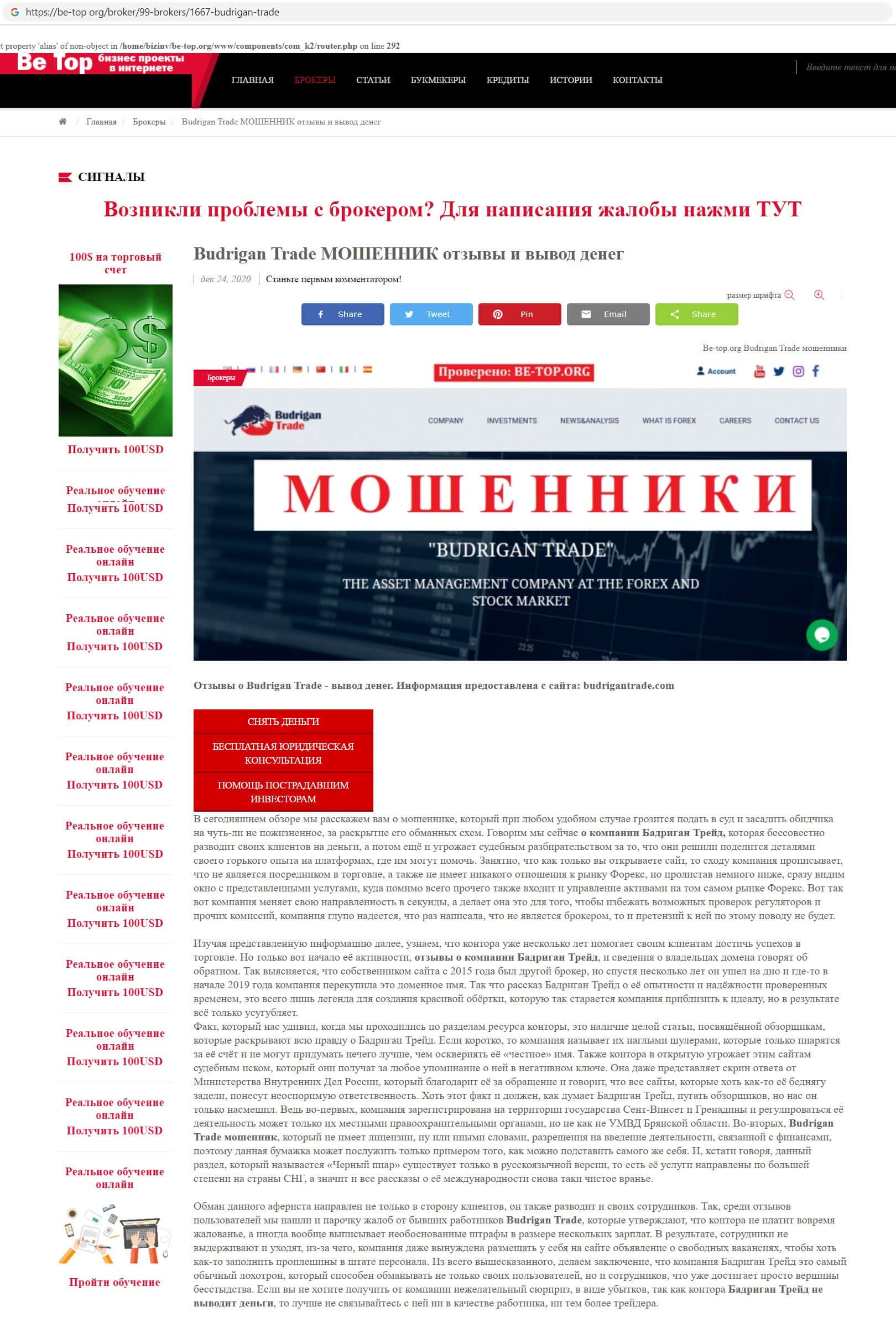 Интернет ресурс be-top org не рекомендует сотрудничать с фирмой BudriganTrade. Статью о лохотроне BudriganTrade мы нашли и на сайте be-top org, который указал, что сотрудничество с данной конторой грозит всем её клиентам полной потерей денежных средств.