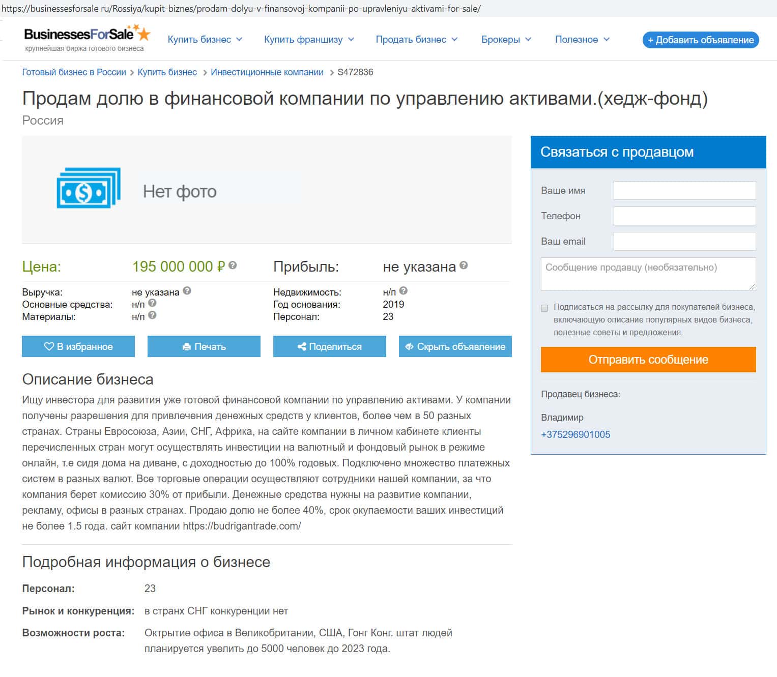 Уже сегодня владелец BudriganTrade продает часть своей мошеннической конторы