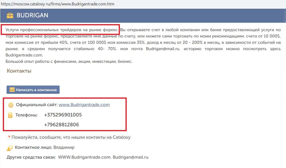 Лицо мошеннической компании BudriganTrade и ее телефонные номера: