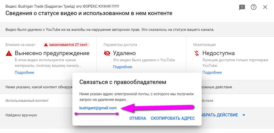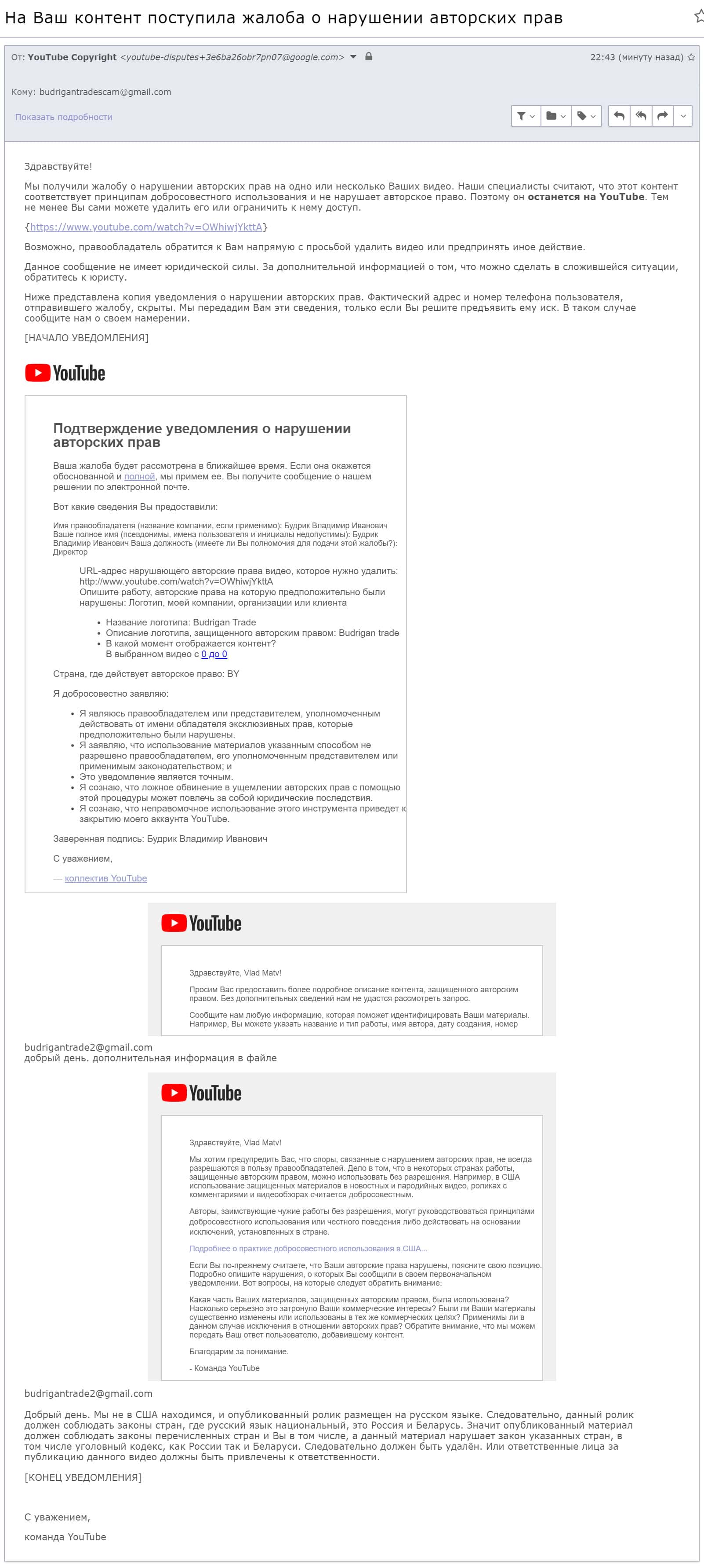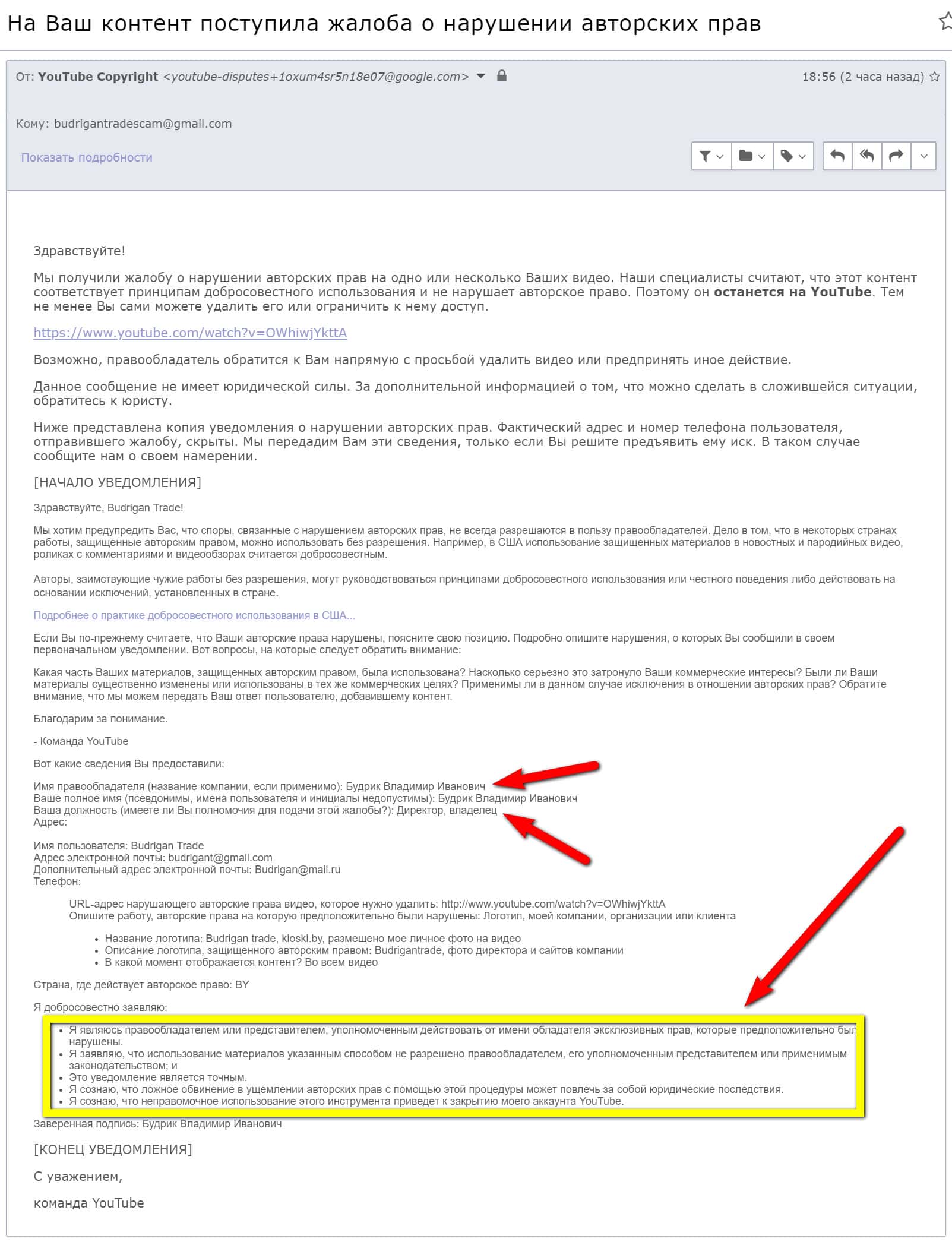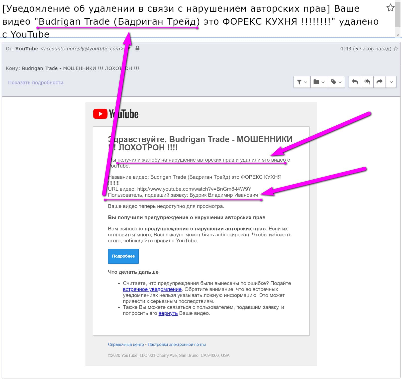 Теперь давайте посмотрим, а собственно с какого е-майла пришел запрос на блокировку данного видео? А пишут жалобу данную с е-майла: [email protected] тем самым связь Будрика Владимира Ивановича и мошеннической компании Бадриган Трейд постепенно подтверждается.