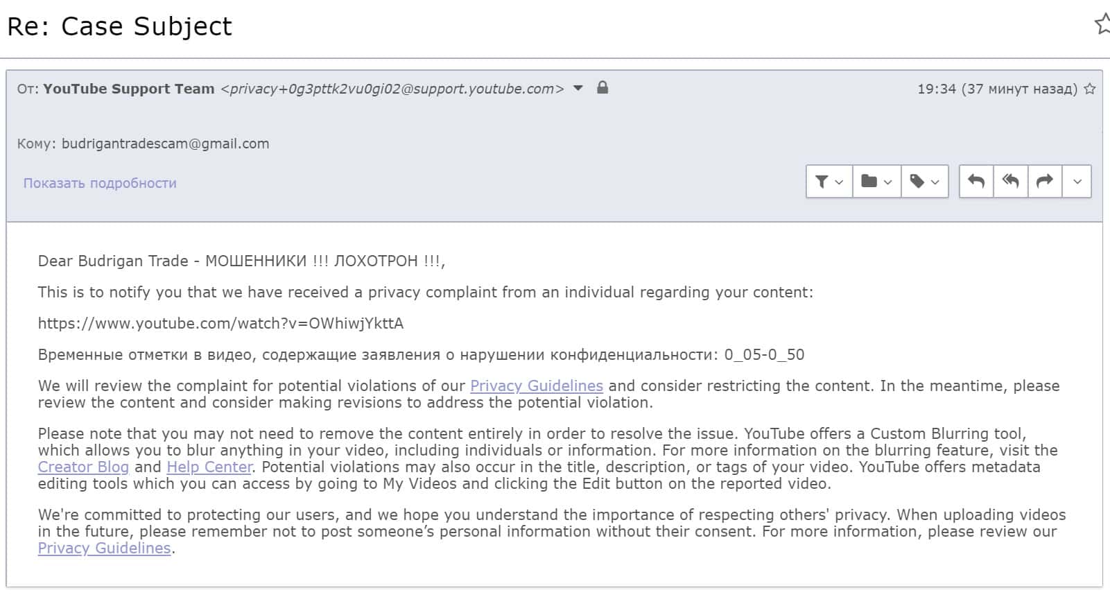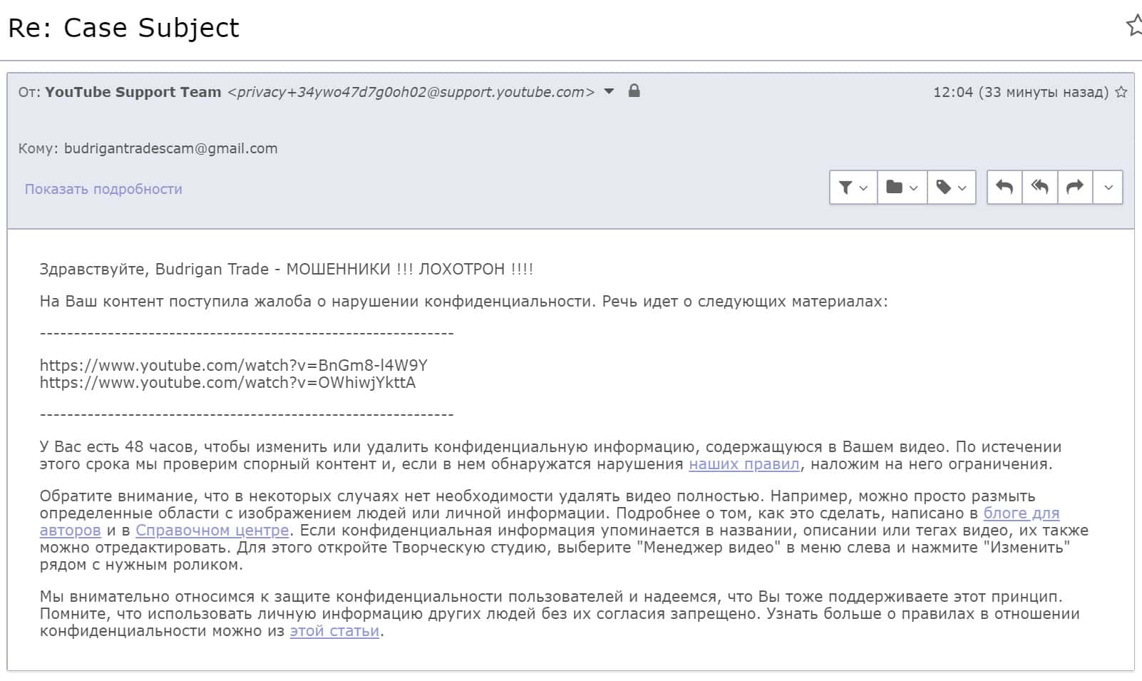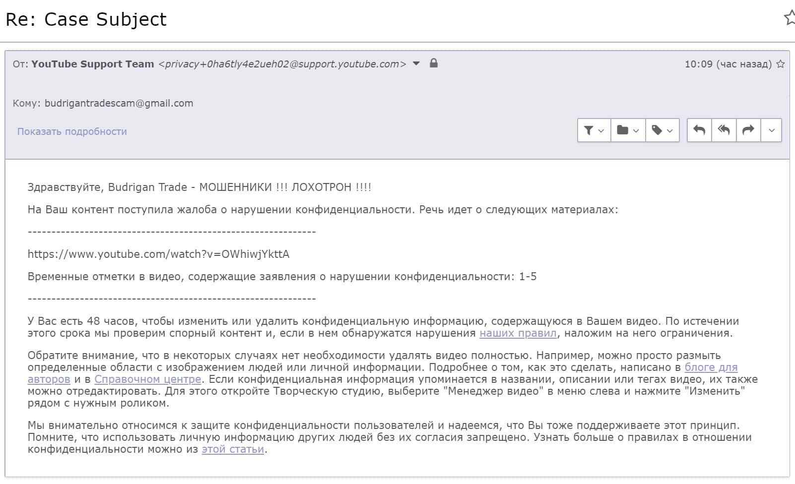 Если Вы думаете, что мошенники из Будриган Трейд пытались убрать видео с разоблачением своего лохотрона только по авторским правам, то Вы ошибаетесь, до этого были еще попытки блокировать видео жалобами на нарушение персональных данных - жалобы приводим ниже.
