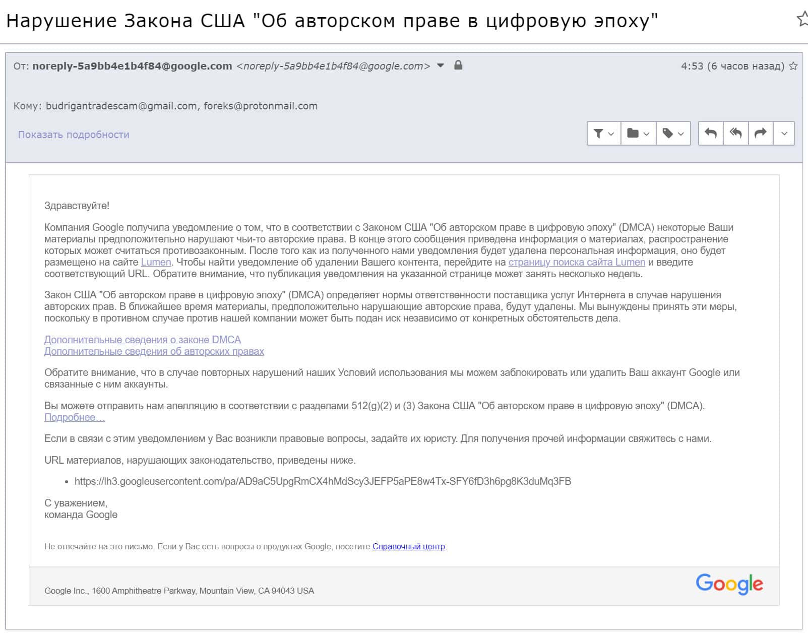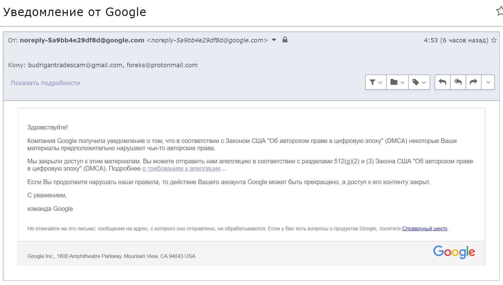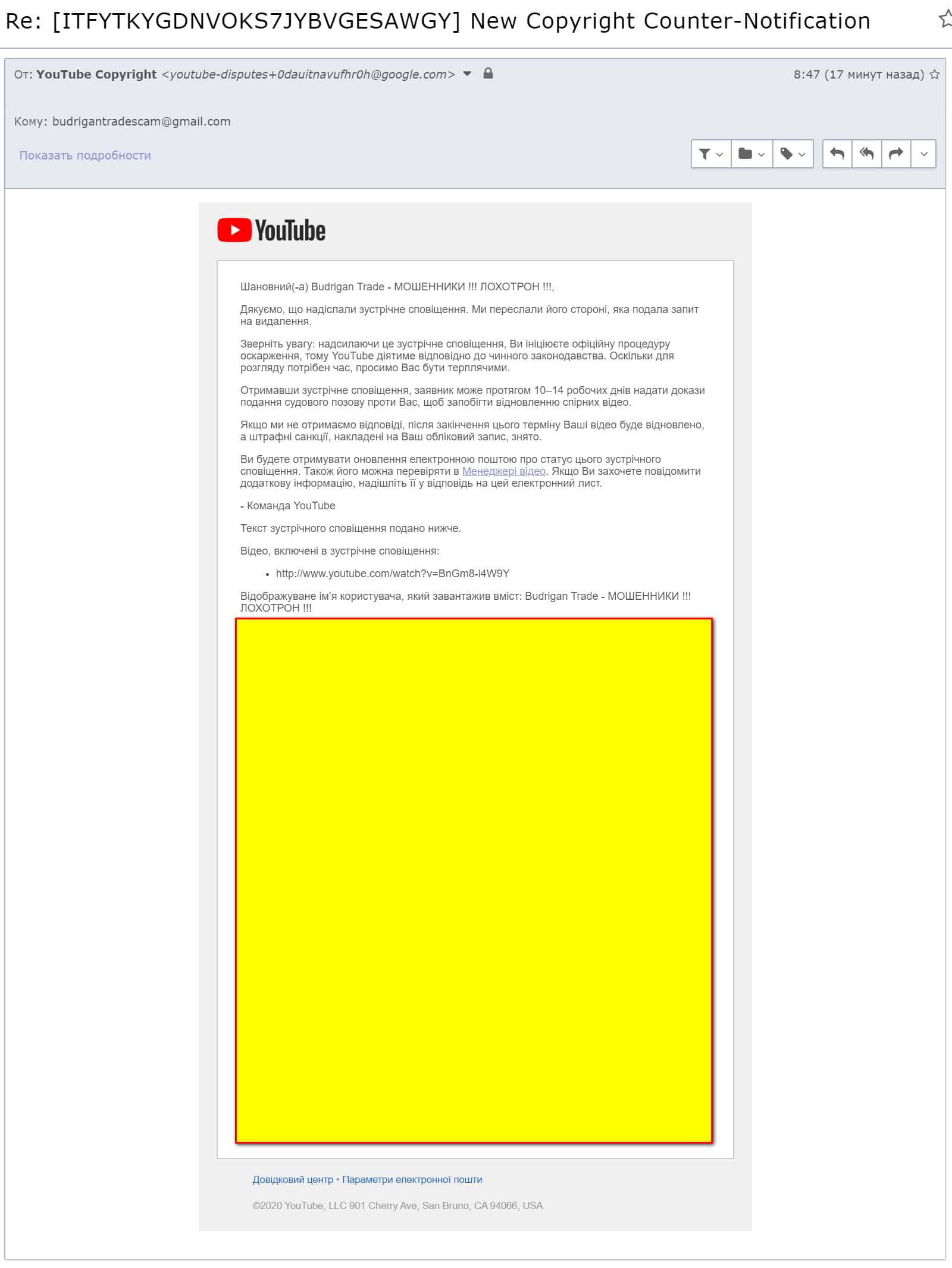 Будриган Трейд не придумали ничего нового, как подать очередную жалобу, на этот раз это DMCA жалоба, на то, что якобы мошенники Будриган Трейд сделали про себя критичный ролик, но этот ролик у них украли - смешны эти потуги, но мошенники должны осваивать механизмы защиты бренда, пока получается плохо. Сами жалобы от гугла приводим ниже.