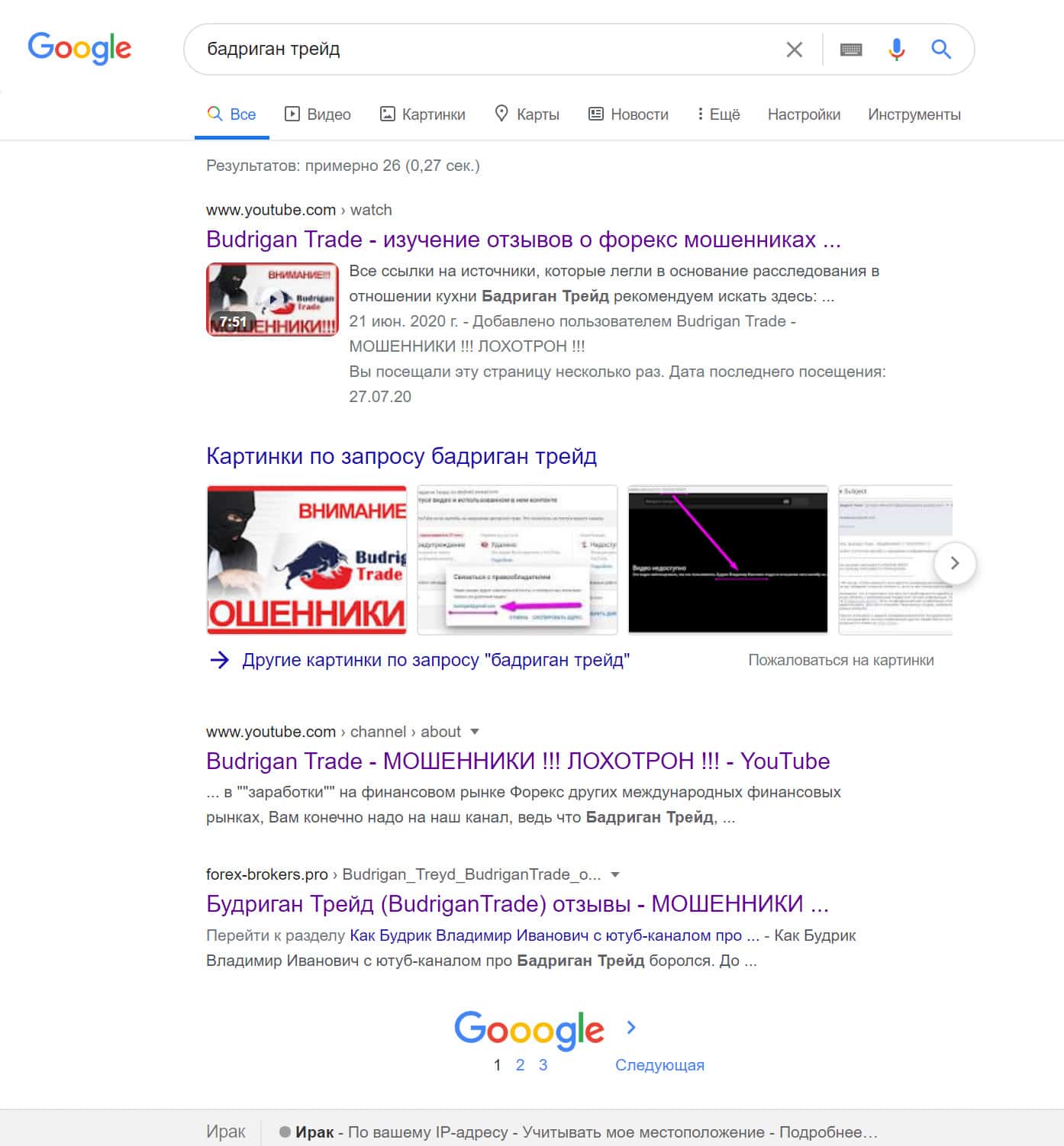 Начнем с того, почему так Будриган Трейд озабочены видео на ютубе, которые как-то так получилось - оказались в поисковой выдаче по ключевым запросам мошенников, пример выдачи в гугле приводим ниже.