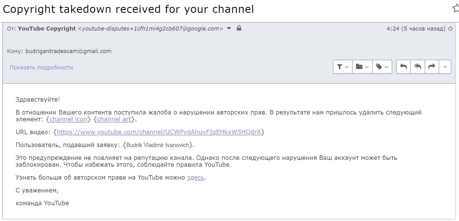 Проблема разных мошенников состоят в том, что их тупости нет предела, в приведенной ниже жалобе в сторону ютуба, на официальный канал BudriganTrade, говорится, что оказывается, видео про самих себя делали сами мошенники BudriganTrade, тем самым мошенники нагло врут, пытаясь заблокировать контент на ютубе, правда безуспешно, но мошенников эта жалоба хорошо характеризует.