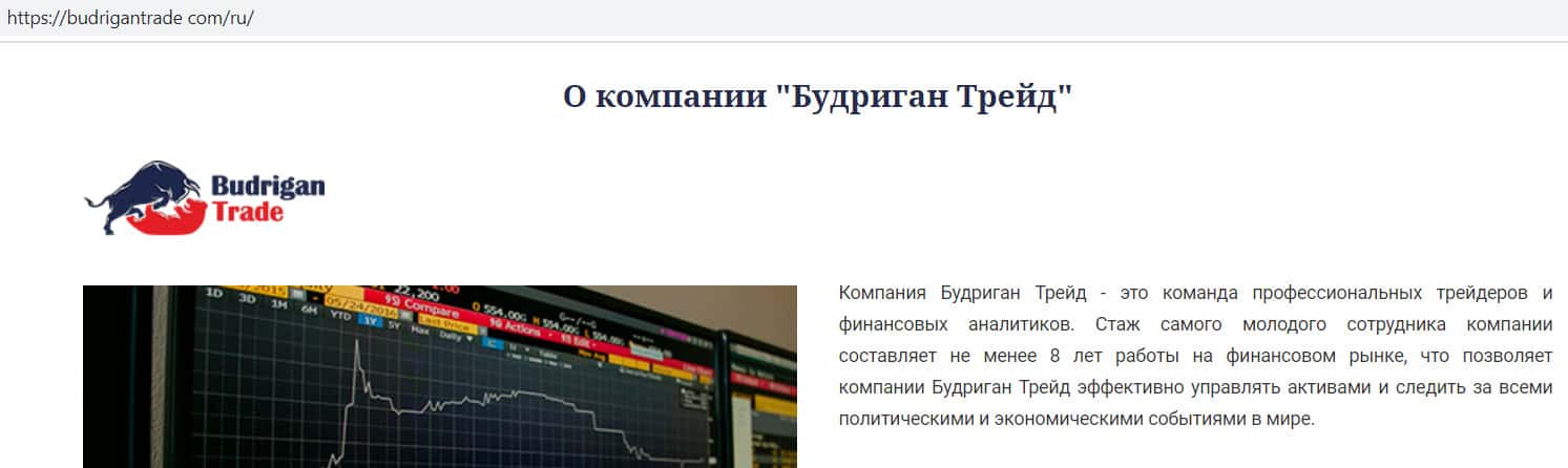 В завершении компания кидал Будриган Трейд опубликовала информацию о себе, где каждое слово является ложью. Контора указывает, что создана профессиональными трейдерами, опыт работы самого младшего достигает 8 лет. Так же компания рассказывает о том, что якобы является быстроразвивающейся компанией в сфере финансовых услуг по управлению активами.