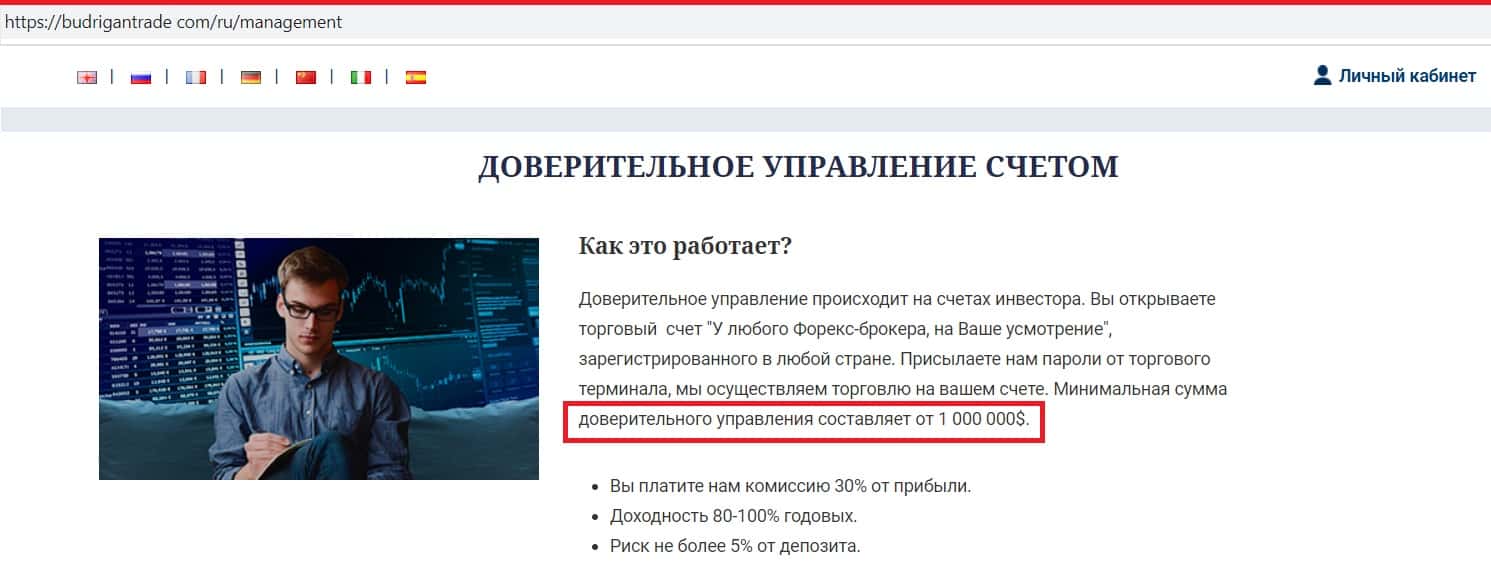 Только вдумайтесь в то, что пишут аферисты BudriganTrade, они заявляют о том, что минимальная сумма для доверительного управления у них составляет от 1 000 000 долларов, и вот такие публикации непонятно вообще для чего делаются, возможно это сделано из-за откровенной тупости владельца сего сайта по сбору денег, не ужели он думает, что люди, владеющие миллионом долларов вкинут эти средства на данную мошенническую интернет-площадку, но аферисты надеются на случай.