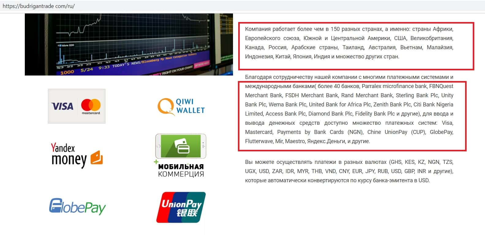Фишкой BudriganTrade является то, что их сайт оформлен более-менее красиво, плюс ко всему этому здесь публикуют откровенно ложную информацию, которая рассчитана на втягивание неопытного человека в данный лохотрон, работающий лишь на ввод клиентских средств.