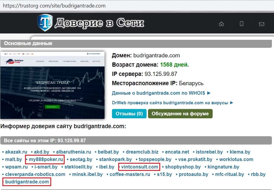 - Аферисты Будриган Трейд делят свой айпи с множеством сайтов