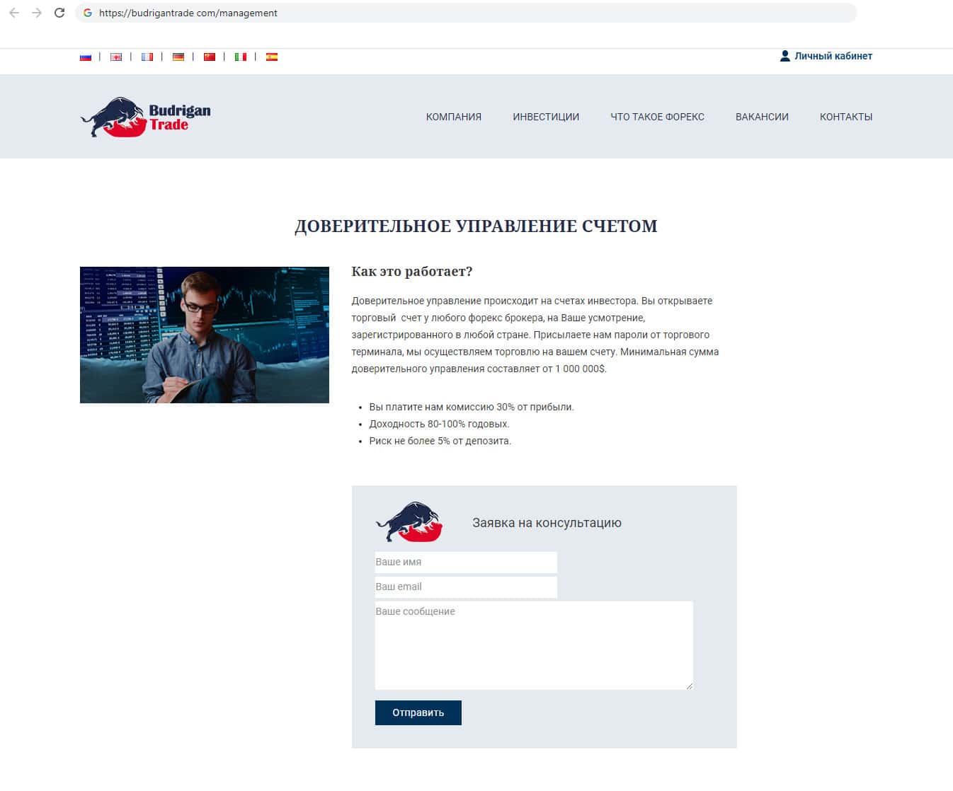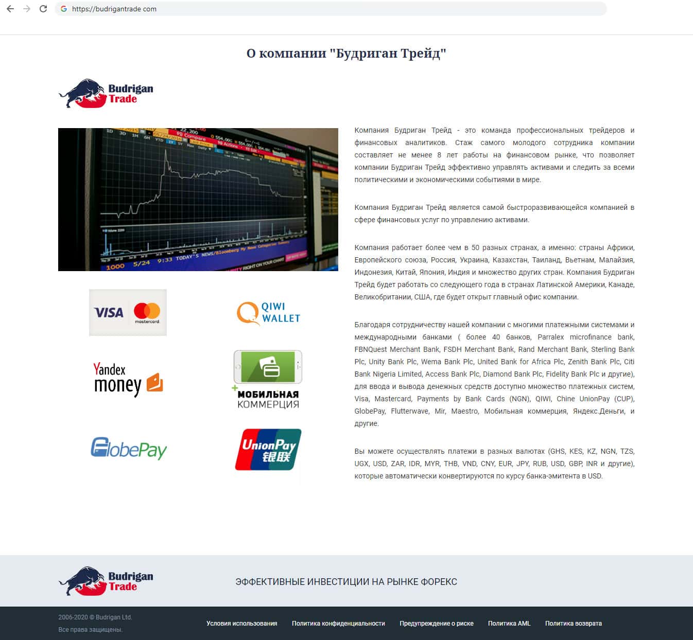 Глядя на главный интернет ресурс компании разводил BudriganTrade сразу становится ясно, что это никакая не крупная фирма, а обычные жулики, которые даже пожалели денег на свой сайт. Это не больше чем коммерческий проект, главной задачей которого является привлечь аудиторию и и заставить её инвестировать деньги.