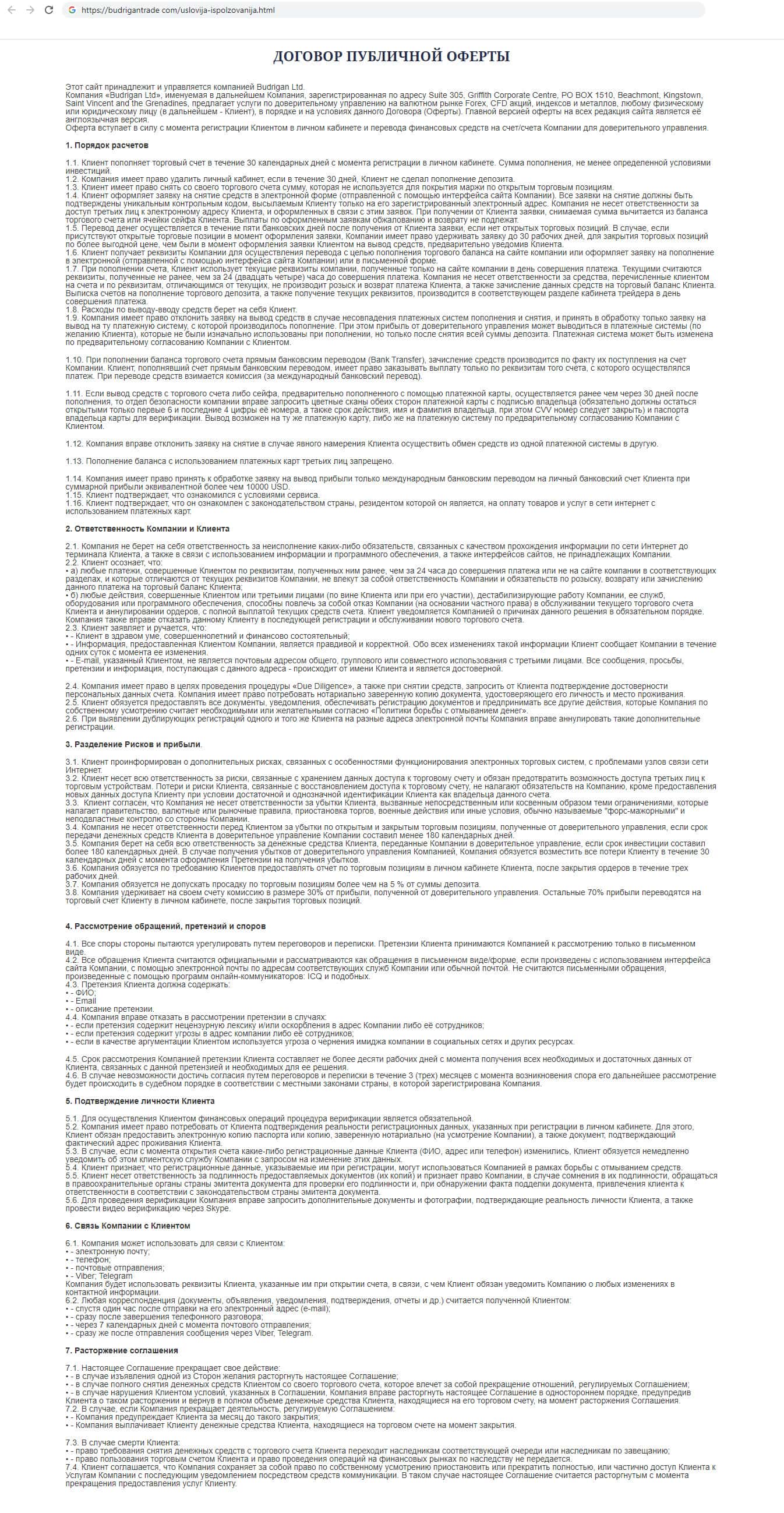 Мошенническая организация BudriganTrade расположилась по адресу: Suite 305, Griffith Corporate Centre, P.O. Box 1510,Beachmont Kingstown Saint Vincent and the Grenadines. Это является офшорной зоной, что уже должно намекнуть пользователям, что денег они больше не увидят. Так же это место очень излюбленно именно финансовыми мошенниками.