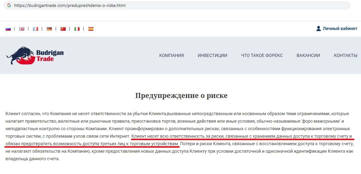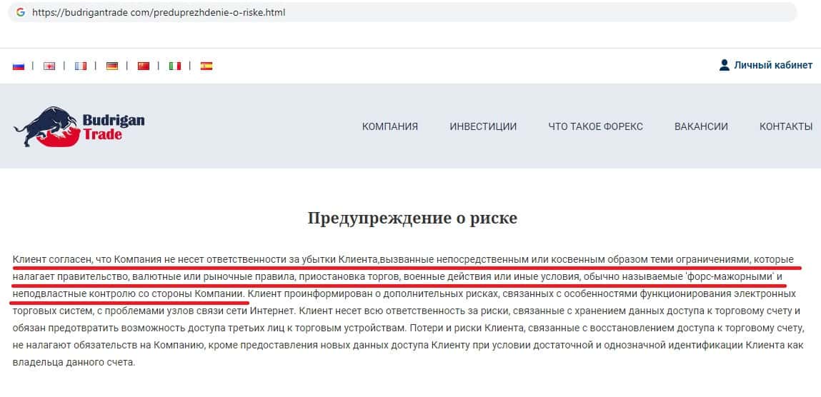 Аферисты Будриган Трейд предоставили клиентам предупреждение о рисках, в котором говорится, что компания не несёт ответственности за потерю средств связанных с форм мажорными обстоятельствами. То есть фирма может ссылаться на любое действие и назвать его форс мажорным, что бы заполучить деньги клиента.