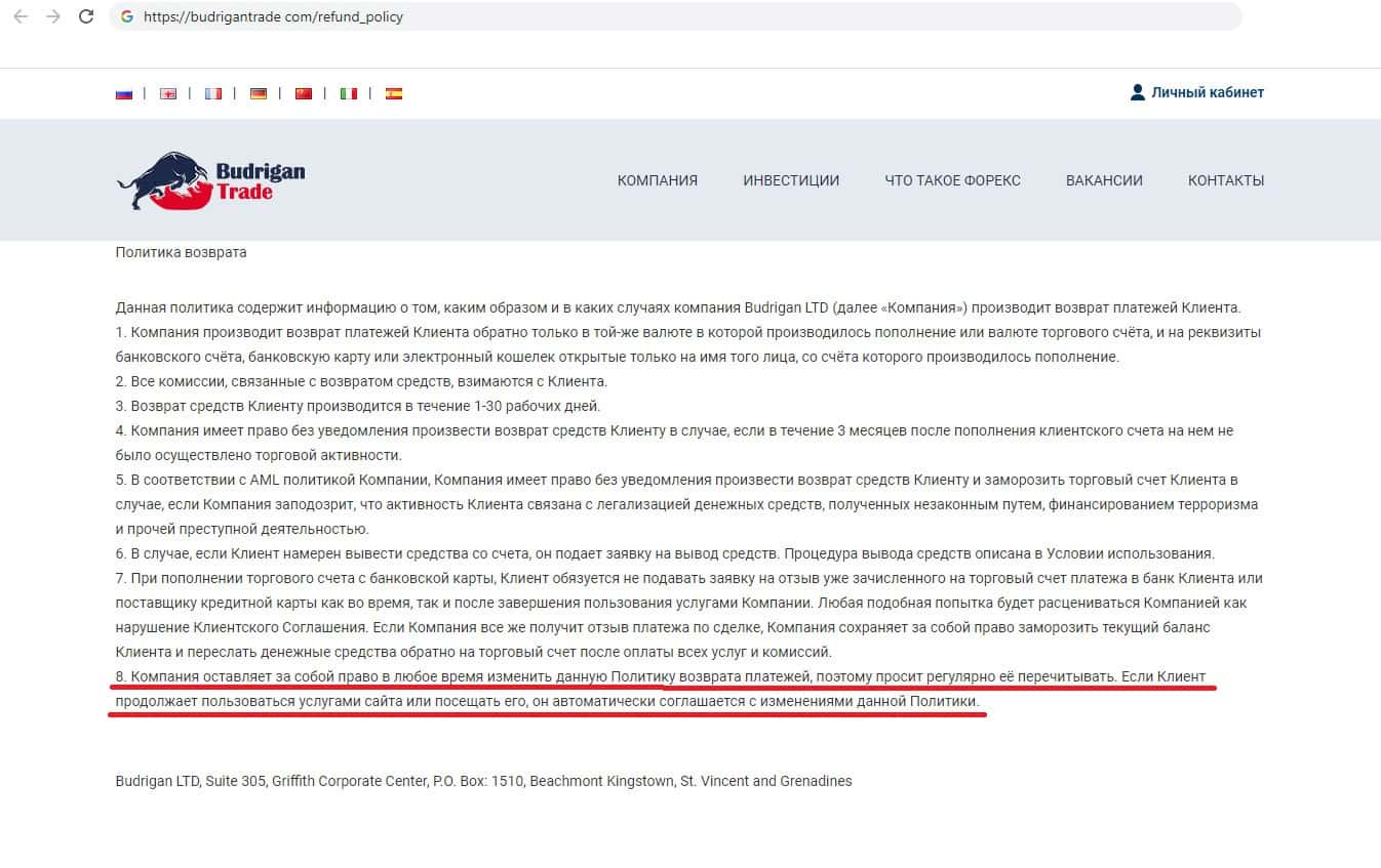 Компания предоставила своим клиентам политику возврата средств, но и тут не обошлось без подвоха. Аферисты BudriganTrade указали, что в любое время могут поменять этот документ, и клиент автоматически с ним соглашается, то есть мошенники могут указать в документе, что не вернут никаких средств, и клиент с этим автоматически согласится.