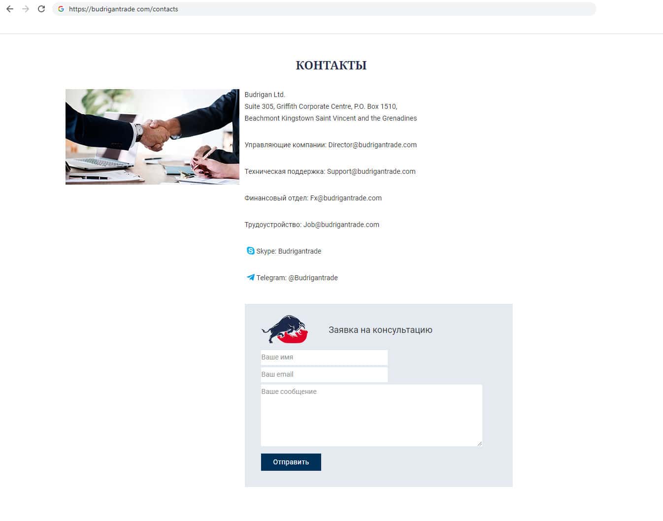 Недоконтора Будриган Трейд указала свои контактные данные, в которых указала все способы связи с фирмой. Так же указан адрес компании. Контактов довольно много ,да же присутствует некая форма связи, которую нужно заполнить, что бы записаться на консультацию. В основном фирма общается по электронной почте. Контакты разводил: