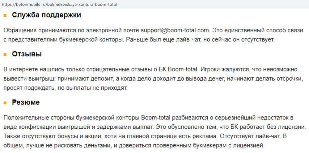 Специализированные ресурсы не рекомендуют пользователям связываться с разводилами Бум Тотал: контора находится в граничащей с черным списком категории, на это есть причины.