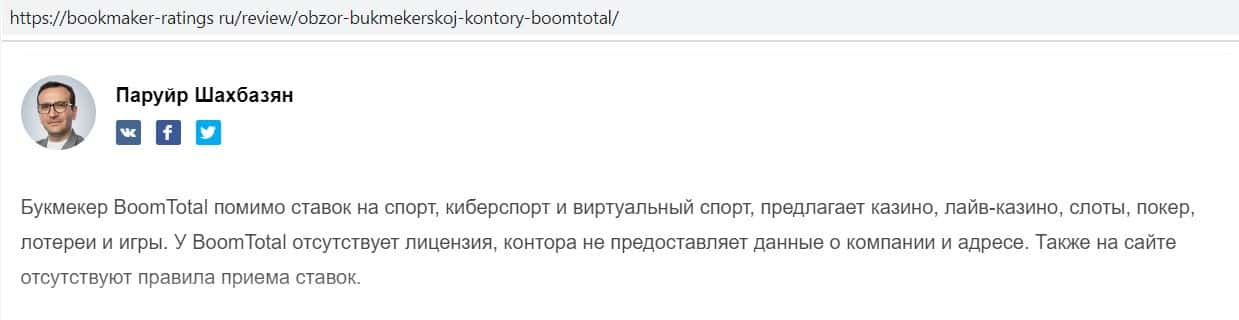 По запросу "БумТотал" результат тот же. Фиктивный букмекер мало привлекает опытных игроков, так как они первым делом проверяют лицензию, которой у шараги, естественно, нет.