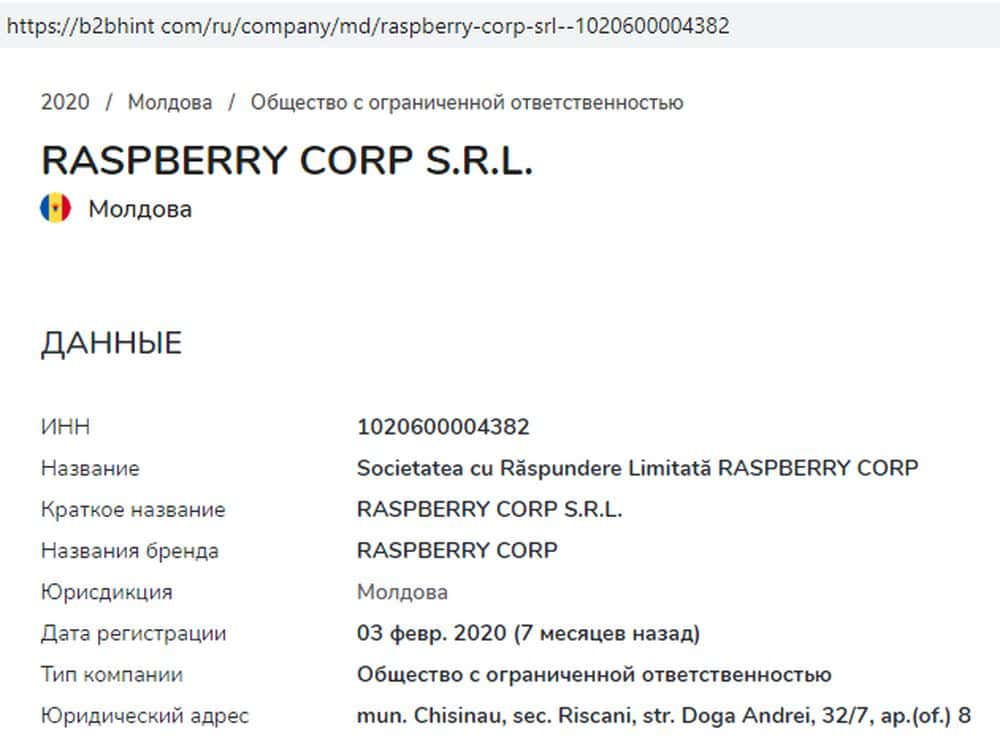 Обработкой транзакций занимается компания Raspberry Corp, которая тоже появилась в 2020 году и зарегистрирована в Молдове - сомнительная связь для якобы английской конторы.