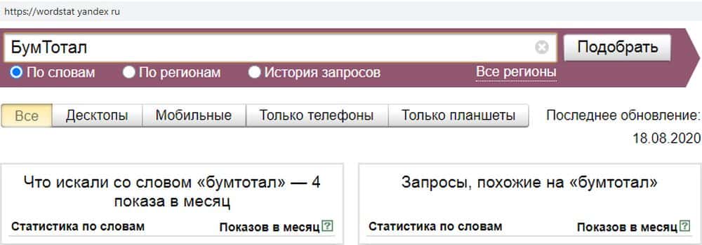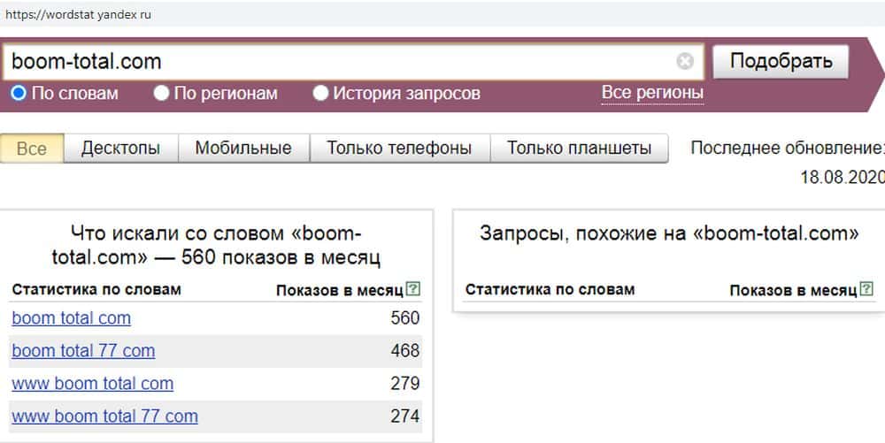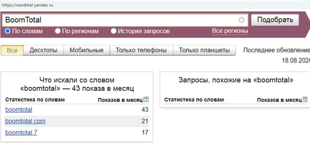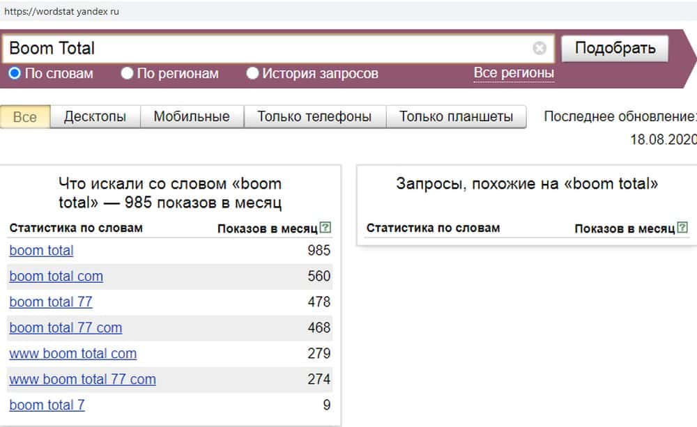 В латинской транслитерации лохотрон более известен. По запросу "Boom Total" было 985 показов, причем люди искали зеркала. Они даже не подозревают, что попадут в ловушку кидал.