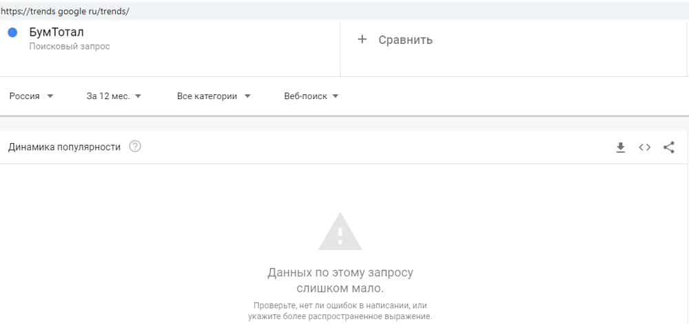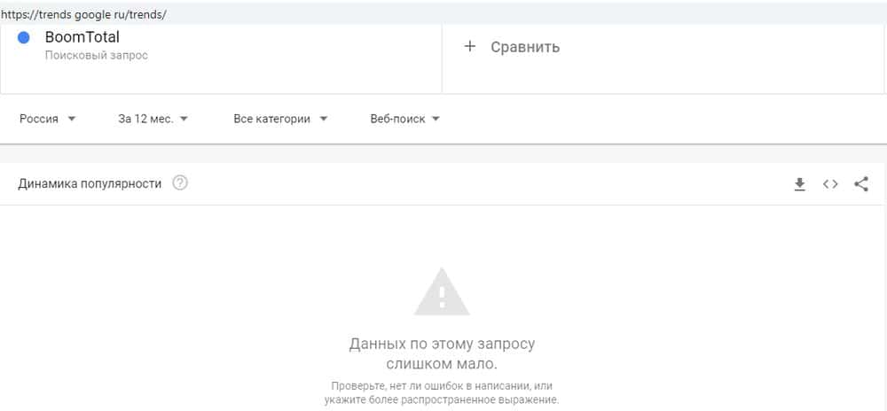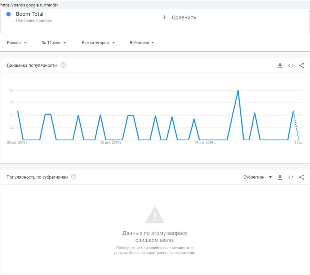 Жлобы Бум Тотал имеют настолько низкий рейтинг популярности, что даже их домен по запросу с точкой "boom-total.com" совсем не интересовал пользователей Гугл за прошлый год.