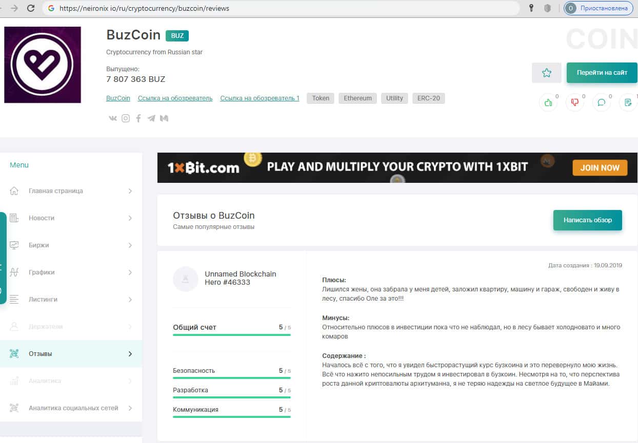 - История развития и скама проекта BuzCoin на портале neironix io