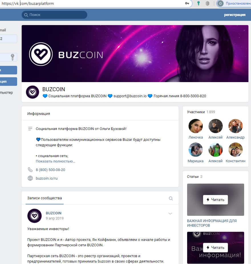 Официальная страница провального проекта BuzCoin в социальной сети ВКонтакте