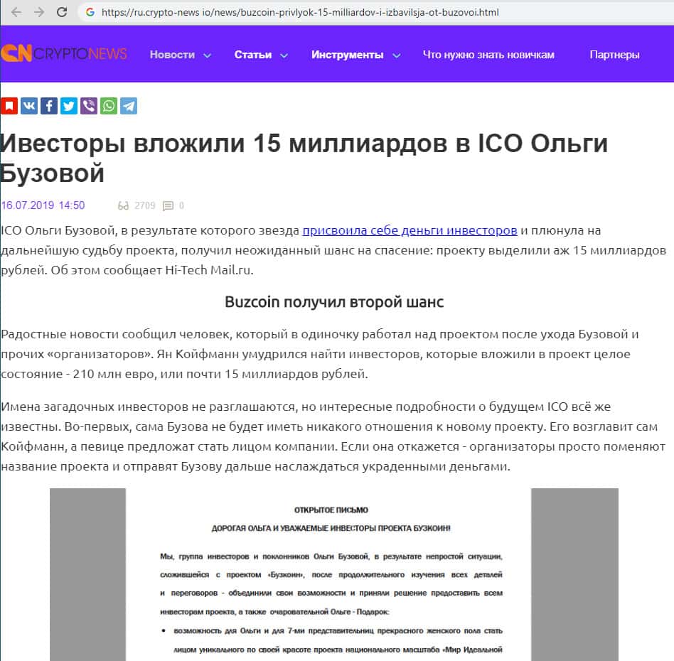 На портале ru.crypto-news io опубликованы две статьи, раскрывающих суть и историю проекта Бузкоин, который являлся откровенным хайпом для его создателей и Ольги Бузовой - пиар-лица. В первой статье Андрей Королев рассказал как организаторы проекта вместе с Ольгой собрали с её фанатов 300 тысяч долларов и покинули проект, оставив Яна Койфманна расхлёбывать.