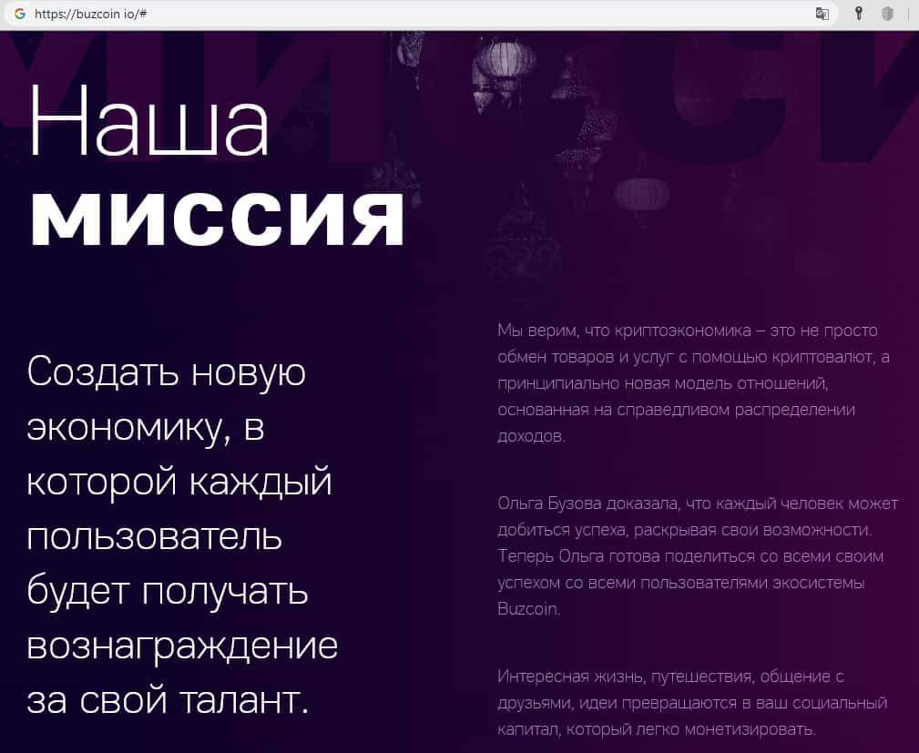 Продолжая осмотр главной страницы сайта, возвращаешься к ощущениям от брошюры и презентационного видео: что это? Презентация жизненного пути Ольги Бузовой или проекта криптовалюты? Приходят на ум мысли, что отдельные представители российского шоу-бизнеса, "отрываясь от земли", в последнее время всё больше и больше издеваются и прикалываются над простым народом.