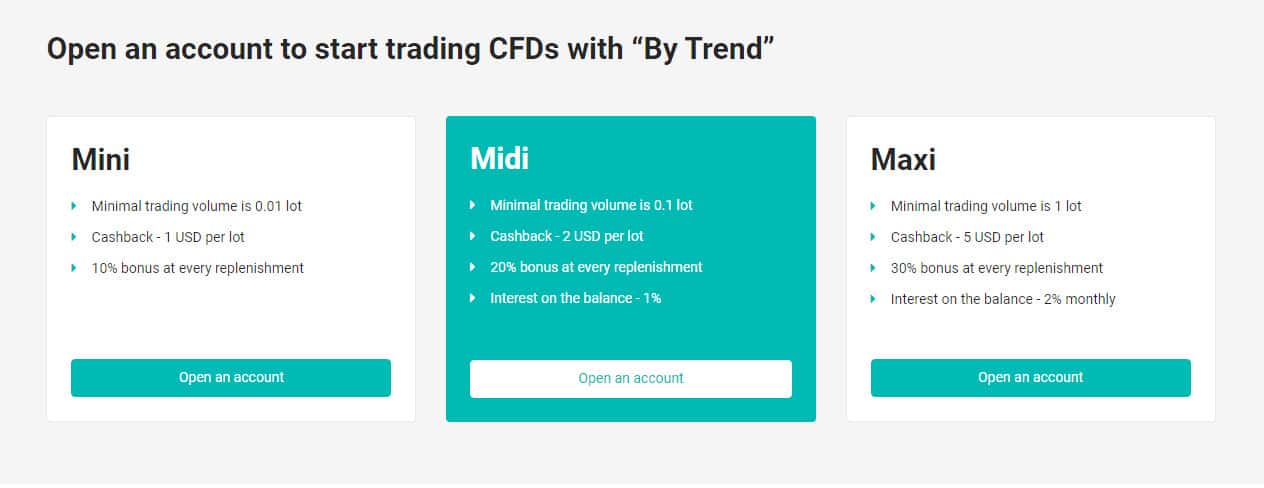 Жулики Би Тренд на своем официальном ресурсе предлагают всем пользователям открыть торговые счета разных номиналов. Существует всего три вида счетов, в которых торговый объем от 0.01 до 1 лота и бонус при каждом пополнении до 30%. Доверчивые торговцы могут купиться на такие условия, но задача аферистов самим заработать юзерах, а не наоборот!!!