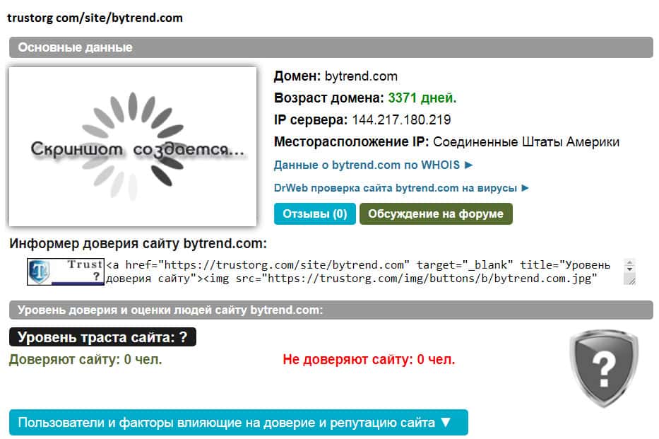 На сегодняшний день в сети существует ряд авторитетных источников, на которых можно сделать проверку любой организации на предмет мошенничества! На одном из них была сделана проверка шараги Би Тренд и выяснилось, что возраст домена превышает 9 лет, а контора была зарегистрирована 06.05.2020. А уровень доверия пользователей равен нулю!!!