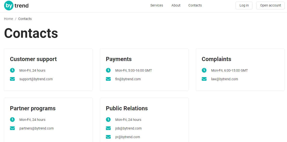 - отдел связи с общественностью: электронная почта - job@bytrend com, pr@bytrend com, график работы: Пн-Пт, 24 часа