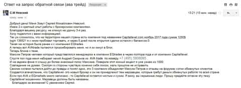 Информация же поступила о том, что Капитал Левел - это Ава Трейд и одновременно ЕКью Трейд от обманутого клиента, причем все 3 компании объединяет мошенник по имени Максим Петров, конечно это никакое не имя, это псевдоним, но тем не менее. Ниже публикуем источник информации.
