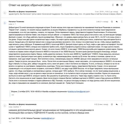 Форекс-кухня Капитал Левел начала привлекать дармовые деньги через такую же главную контору Маркет Стат. Клиенту позвонила Анастасия Романова и предложила вложить деньги в акции. Женщина согласилась и на уловки и Андрей Решетников помог ей зарегистрировать свой счет в брокерской конторе Capital Level и перевести первый депозит в 1500 долларов. Торговлю на ее счете проводил Дмитрий. Парень неплохо торговал, но часто звонил выпрашивал вложить еще больше денег. Женщина сломалась и вложила 2 суммы: 8000 и 9600 долларов. Однажды одна из сделок стала уходить глубоко в минус и трейдер начал просить вложить 20000 долларов для спасения ситуации. Ну а дальше все происходило как в страшном сне и мошенникам удалось развести бедную жертву еще на 46 000$ и 30 000$. В итоге все деньги были слиты, а аферисты увильнули от ответственности. Еще лохотронщики, которые занимались вымогательством: Александр - начальник отдела, Мариус - директор компании, Вахтанг - кризисный управляющий.