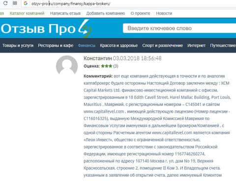 Один человек заметил аналогию работы форекс-конторы Каппа Брокерс и кухни Капитал Левел. Все те же схемы развода сразу кидаются в глаза опытному трейдеру. В своем отзыве он указывает все данные как филиала Капитал Левел, так и данные о смежном расчетном агенте обоих лохотронов. Судя по этому, возможно, они имеют одного и того же хозяина-преступника.