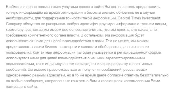 Что касается политики конфиденциальности, то тут мошенники Капитал Тайм скопировали обычный текст, подставив где нужно название своей компании. Однако, учитывая истинную суть данных шулеров, не удивительно, что они могут собирать личные данные клиентов, и, например, продавать их другим мошенникам, что мы можем часто наблюдать.