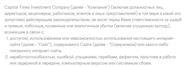 Всю суть мошеннической организации Capital Times мы можем видеть в одном особом документе, который они максимально спрятали в недрах своего веб-сайта. Документ об ограничении ответственности. Здесь-то мы и видим, что мошенники Капитал Тайм является не серьезной компанией, а очередной шарашкой, кидающей людей на деньги.